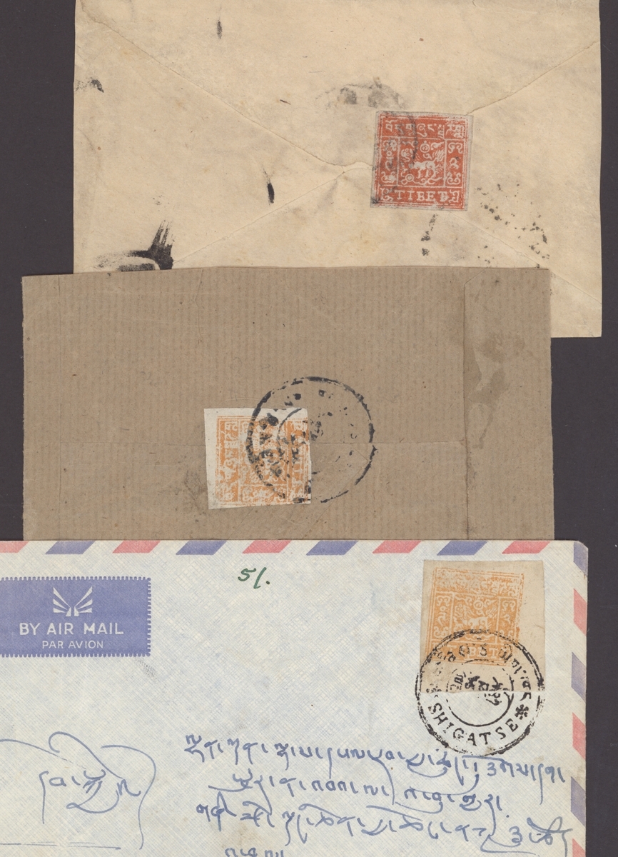 1936-40 (c.) three local registered covers, each bearing 2tr. in shades of scarlet to orange and chestnut including air mail envelope with fine Shigatse postmark. (3 covers)