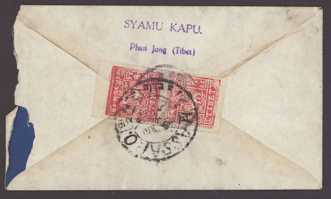 1937 (c.) merchant's envelope from Phari to Lhasa bearing, on the reverse, 2tr. rose-carmine vertical pair, setting 1 [3/7] tied by faint Phari postmark and a good strike of the large Lhasa type 2 postmark. Fine and very late use of the Lhasa postmark and a very high franking for this period. Photo