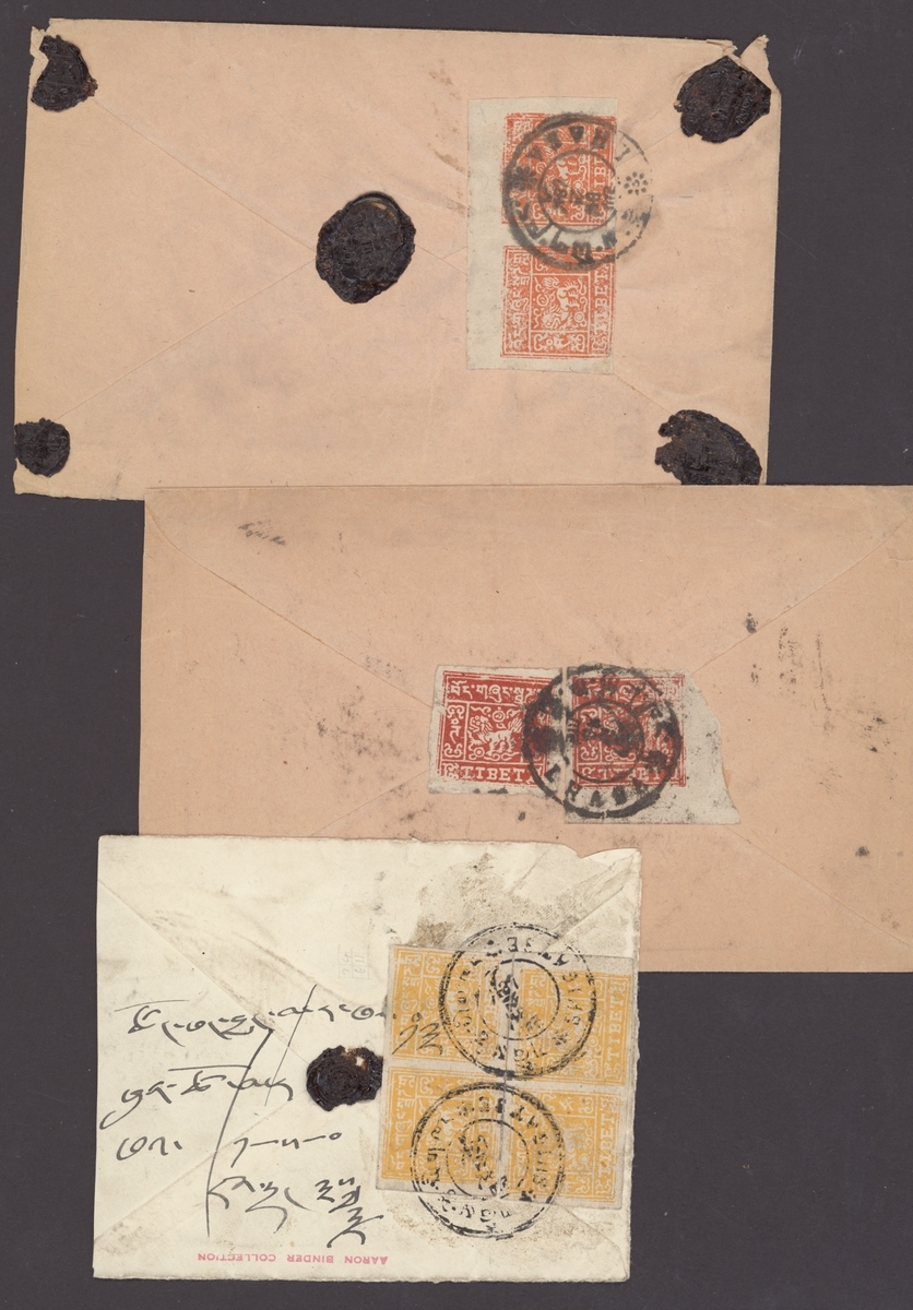 1937-42 (c.) local envelopes with 1tr. pale scarlet-vermilion pair tied by Lhasa postmark, 1tr. brown-red (2) tied by Lhasa postmark plus cover back bearing ½tr. lemon-yellow (2 pairs) tied by Shigatse postmark. (3 covers)