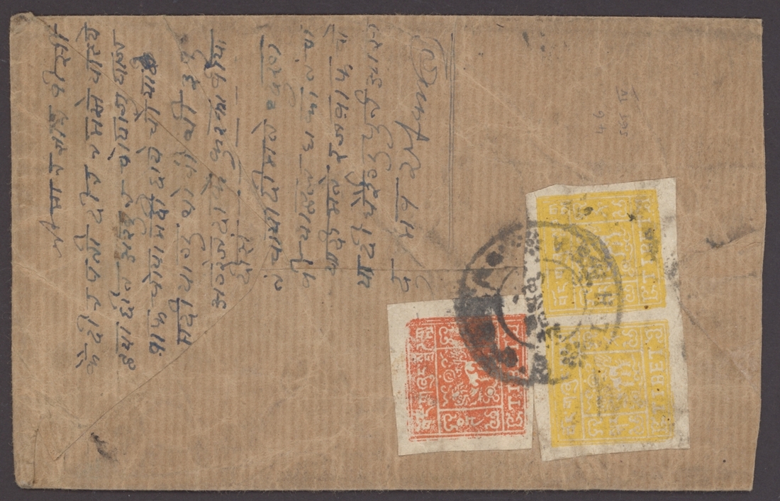 1939 (c.) home-made envelope to Gyantse bearing, on the reverse, ½tr. chrome pair with 1tr. pale scarlet-vermilion tied by Lhasa postmark; an attractive franking