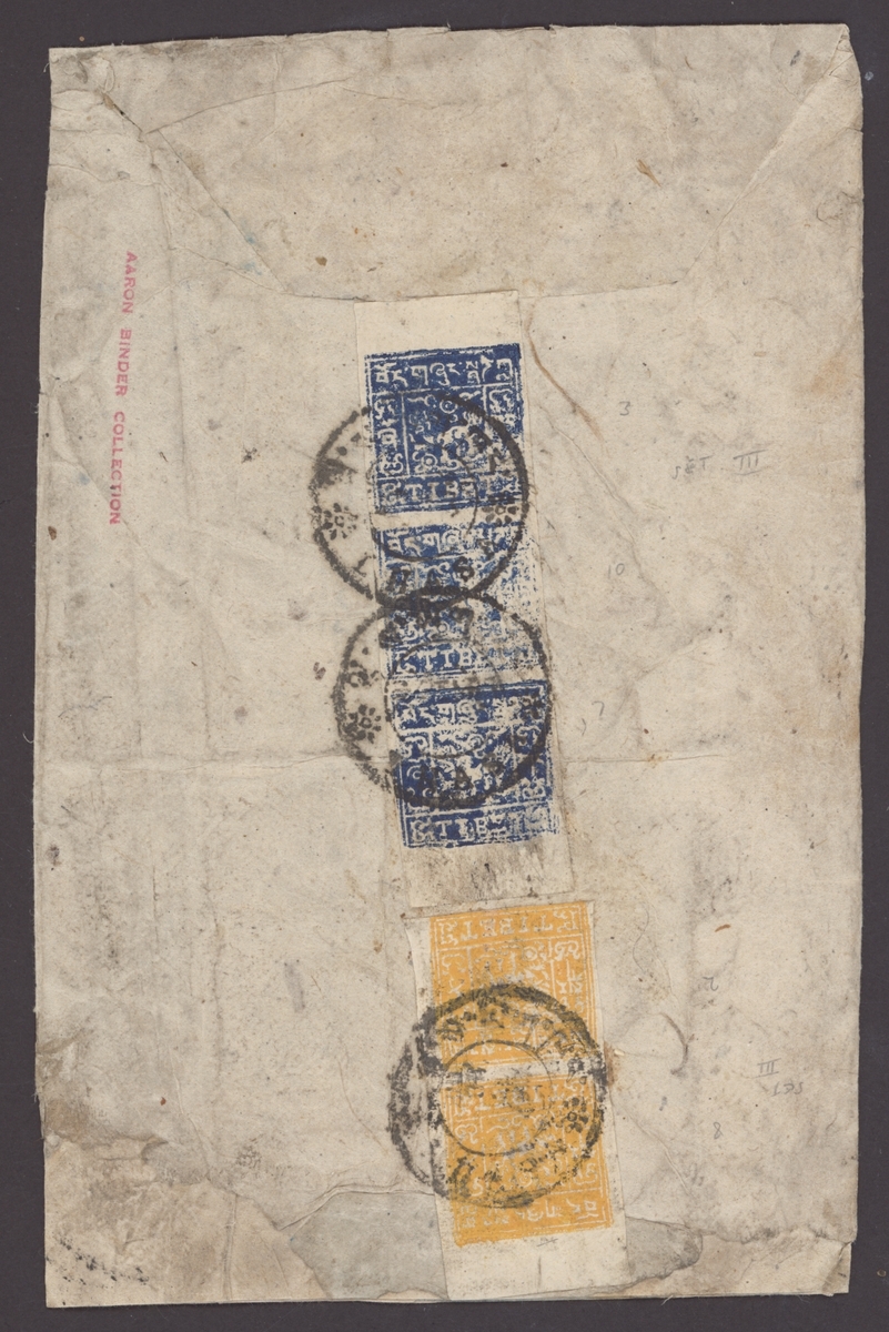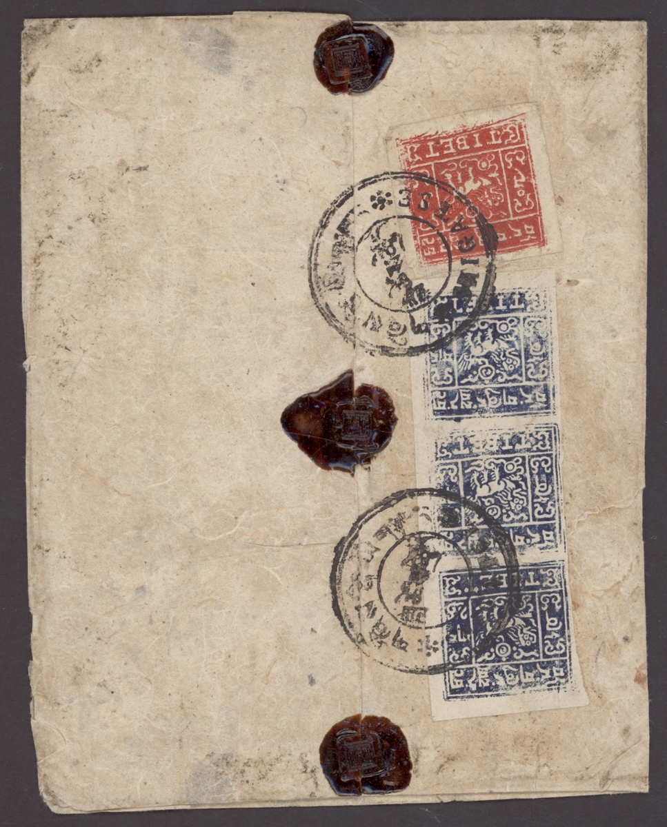 1945-46 (c.) two registered native covers bearing, on the reverse, ½tr. golden yellow pair with 2/3 tr. dark blue in a vertical strip of three setting 2 [5/1/8] tied by Lhasa postmark; the second cover with 2/3 tr. indigo vertical strip of three, setting 3 [2/10/7] with 1tr. deep scarlet-vermilion tied by fine strikes of Shigatse postmark. An attractive and colourful pair of covers. Photo