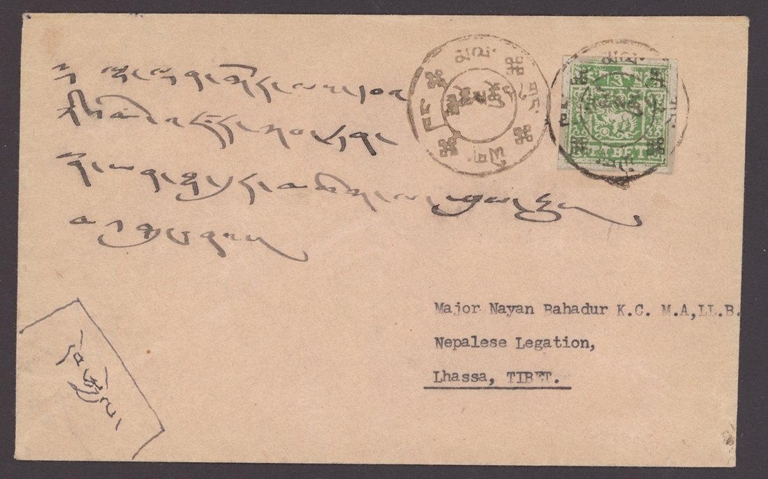 1943-45 (c.) envelope registered to the Nepalese Legation, Lhasa bearing 4tr. bright yellow-green tied by a fine strike of Medagongkur type 3 postmark with a second strike alongside with the manuscript registration in the lower corner. A fine and exceptional cover. Photo