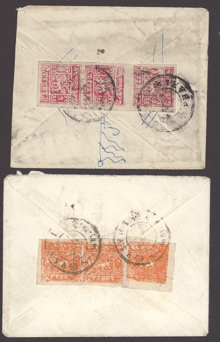 1945-47 (c.) two small envelopes, the first bearing 1tr. bluish red in a vertical strip of three tied by good strikes of Phari type 2 postmark with merchant's device drawn on the flap; the second bearing, on the reverse, 1tr. bright orange (3) tied by Phari postmark. A striking pair of covers