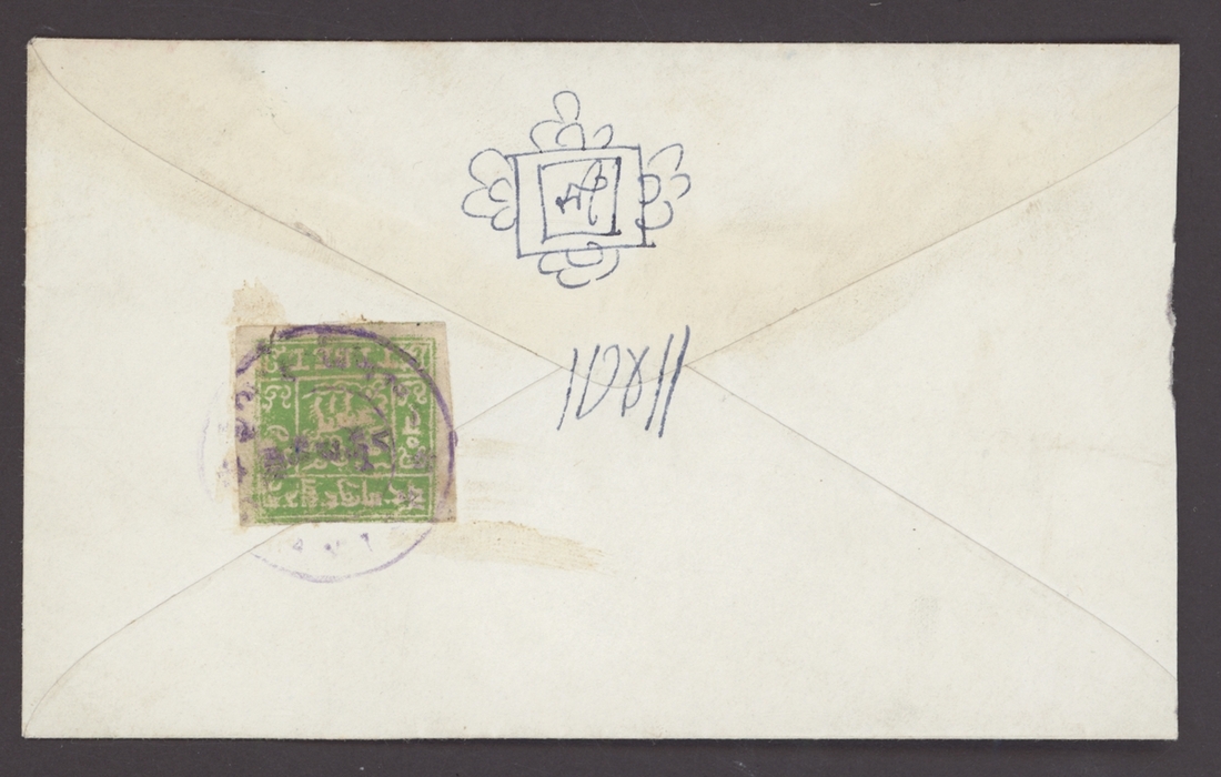 1946-47 (c.) registered envelope bearing, on the reverse, 4tr. yellow-green tied by a good strike of Gyantse type 2 postmark struck in purple, manuscript registration is on the address side. Photo