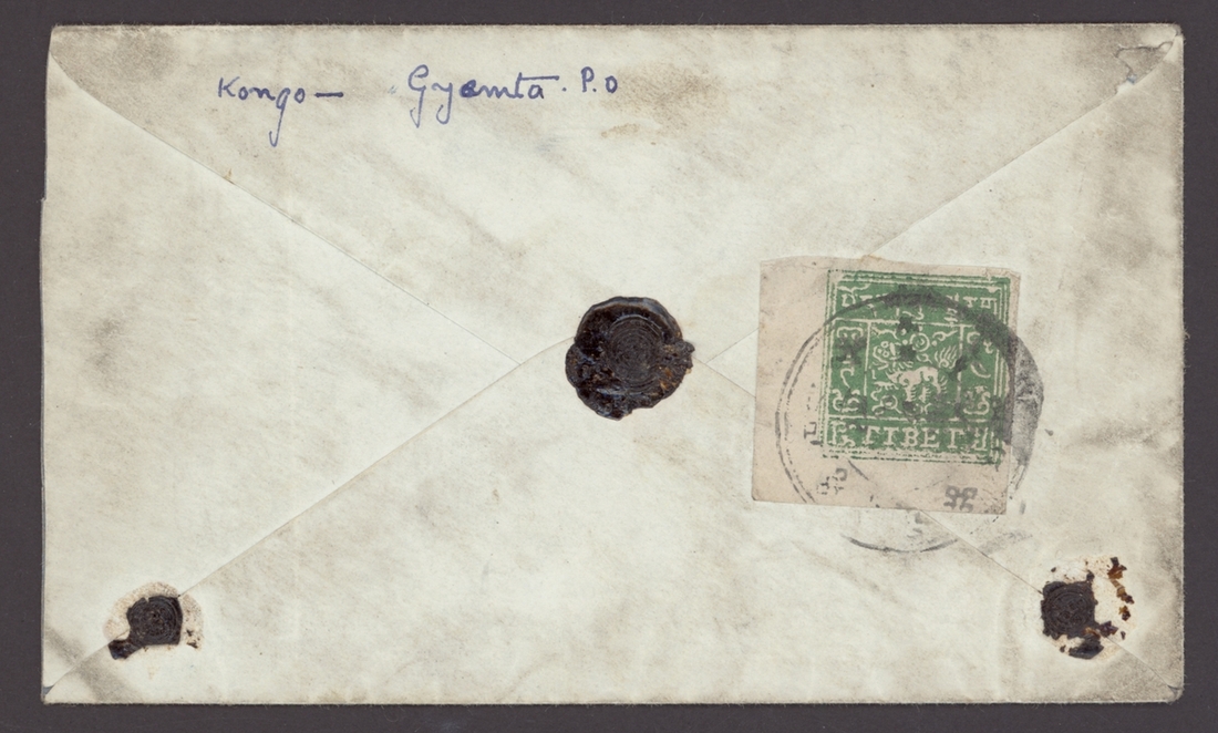 1947 (c.) registered cover bearing, in the reverse, 4tr. apple-green with lower left corner margins [9] tied by a good strike of Gyamda type 3 postmark with three wax seals; light soiling. Very scarce with only a handful of commercial covers recorded. Photo