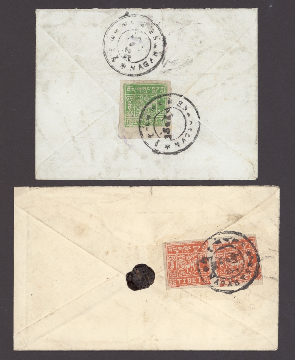 1947 (c.) registered cover bearing, on the reverse, 4tr. apple green tied by a fine strike of Nagartse type 2 postmark with a second strike alongside, manuscript registration on the address side; a second registered cover bears, on the reverse, 1tr. pair in scarlet-red, pair from setting 3 [8-9] tied by a fine strike of the Nagartse type 2 postmark, the manuscript registration is on the address side. This is a possible postal fraud using 1tr. value instead of 2tr. in a similar colour - both numeral "1" have been covered by the postmark. (2 covers). Photo