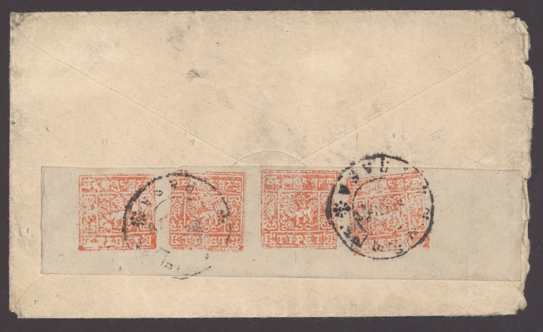 1950 (c.) envelope with handstruck address and registration bearing, on the reverse, 1tr. orange-vermilion lower sheet row of four, setting 3, tied by Lhasa postmarks, with printed registration mark on the address side; vertical crease at side which runs through the sheet margin. A good franking. Photo