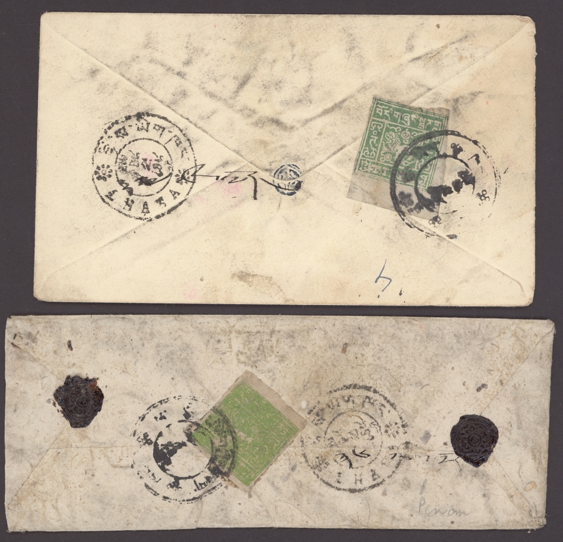 1950-51 (c.) two envelopes registered to Lhasa bearing, on the reverse, 4tr. light bottle green or 4tr. bright yellow-green tied by Penam type 2 postmark with Lhasa arrival alongside, manuscript registration is on the address side. A good pair of covers. (2 covers). Photo