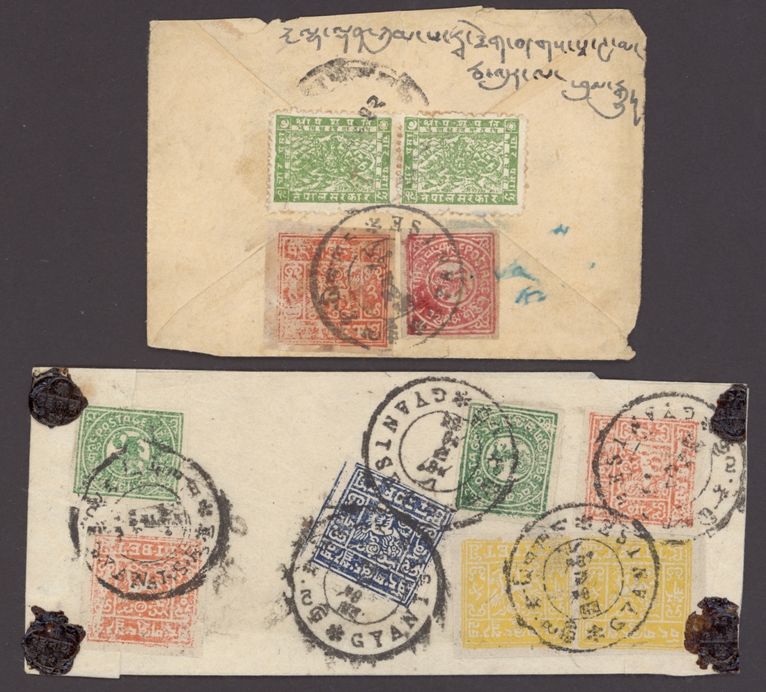 1953 (c.) hand-made envelope registered from the Gorka office in Shigatse to the Gorka office in Shigatse bearing, on the reverse, ½tr. golden yellow pair, 2/3 tr. indigo and 1tr. dull salmon (2) used in combination with 1912 1/6 tr. yellow-green (2) tied by fine Gyantse postmarks, manuscript registration is on the address side. Correctly pays the 4tr. rate including registration. Also an envelope from Nepal to Lhasa via Gyantse bearing, on the reverse, Shiva 4p. green pair tied by large Katmandu postmark with Tibet 2tr. orange-brown with 1912 1tr. rose-carmine tied by Gyantse postmark. Good combination covers. (2 covers). Photo