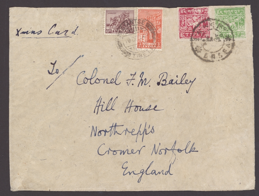 1949 (Dec.) handmade paper envelope to Col. Bailey in Cromer, Norfolk, bearing 1tr. bluish red and 4tr. yellow-green shade tied by Lhasa postmark, with India 6p. and 3a. tied by Gyantse/Tibet type B4 c.d.s. (10.12). The envelope is marked "Xmas Card". Overpays the 4tr. rate. Photo