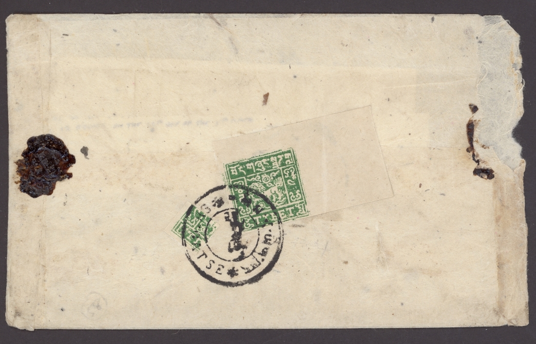 1952 (c.) native registered envelope bearing, on the reverse, 4tr. jade-green from the top right corner with sheet margins, used with a quartered 4tr. in the same colour tied by a fine strike of Shigatse postmark; vertical fold runs through the stamp margin. An attractive cover. Photo