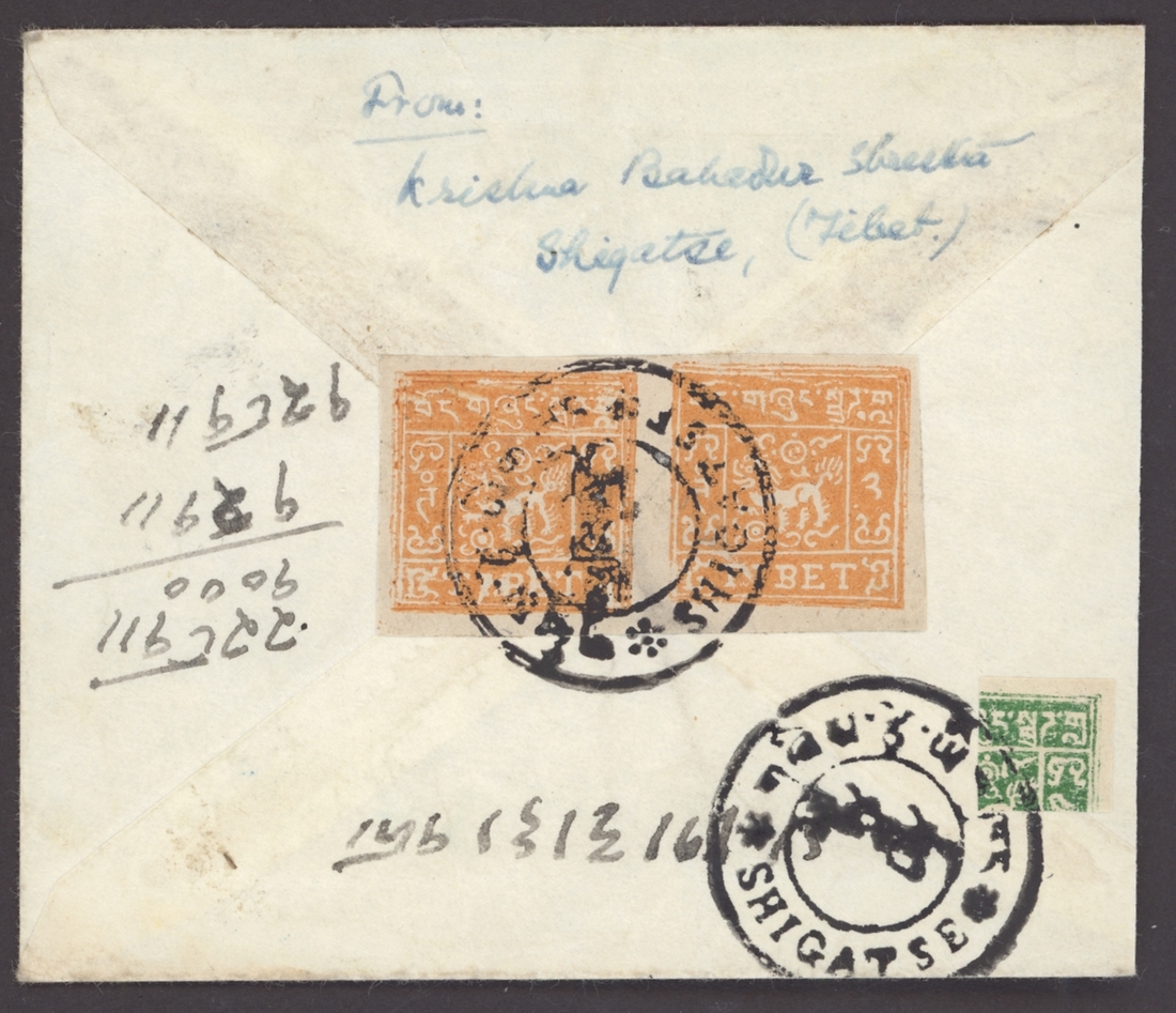 1952 (c.) envelope registered to Gyantse bearing, on the reverse, 2tr. dull yellow-orange pair with quartered 4tr. jade-green tied by fine strikes of the Shigatse postmark. Photo