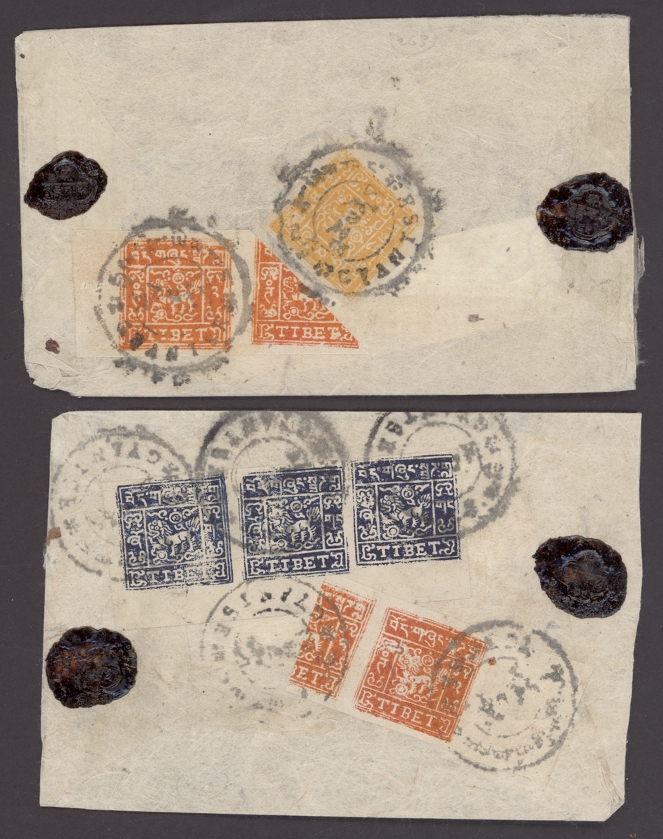1952-54 (c.) two native registered envelopes from the same correspondence bearing, on the reverse 2/3 tr. strip of three from the foot of the sheet [2-12-4] with 2tr. dull orange single with vertical bisect tied by Gyantse postmark; also 2tr. bright orange in pair with diagonal bisected with 2tr. yellow-orange tied by Gyantse postmarks. Attractive and colourful frankings. (2 covers). Photo