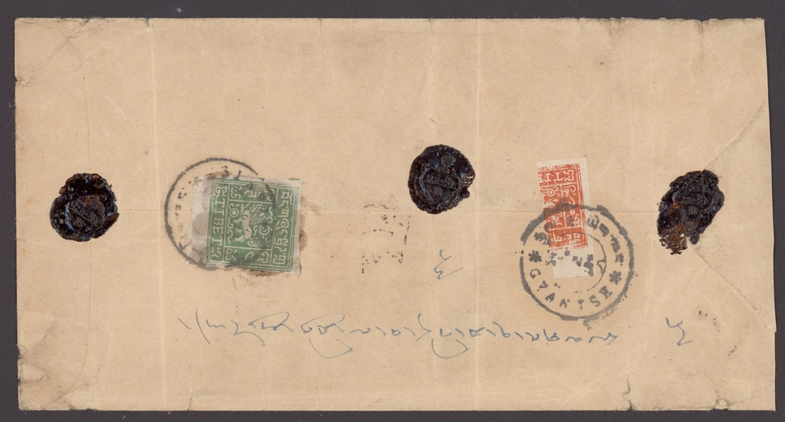 1953-55 (c.) long envelope registered to Lhasa bearing, on the reverse, 2tr. bright orange vertically bisected with 4tr. dull green tied by Gyantse postmark with wax seals of the Nepalese consular officer; with manuscript registration markings in the address side and marked as the 15th day of the 8th month; two vertical folding creases away from the adhesives. Photo
