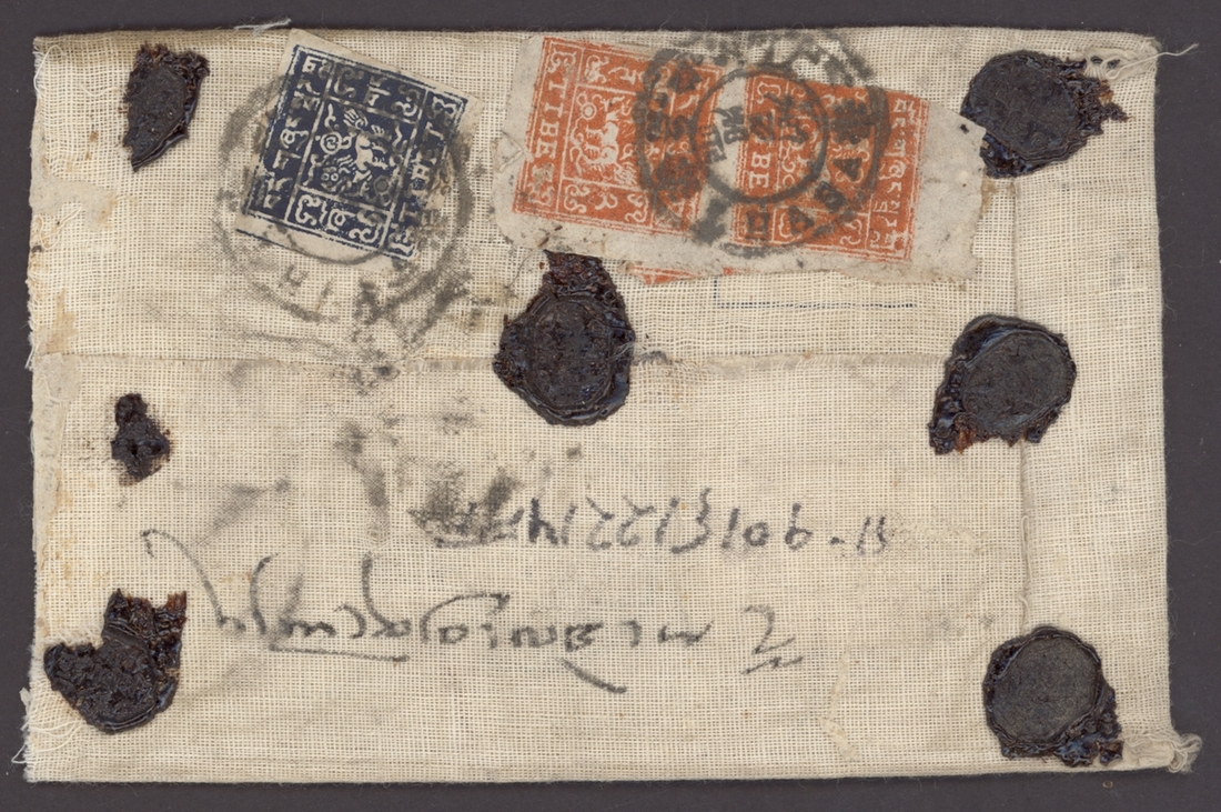 3 2/3 tranka: 1950's (c.) a turned registered stationery cover with the linen on the outside bearing, on the reverse, 2/3 tr. indigo with 2tr. bright orange pair tied by Lhasa postmark and with seven wax seals, the manuscript registration in on the address side. The original envelope was registered from Nepal and bears the blue on white registration label and part of the India postage. Unusual. Photo