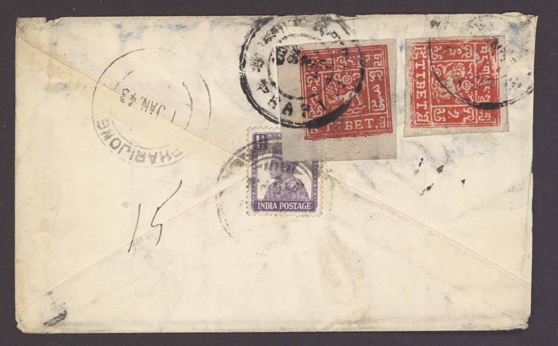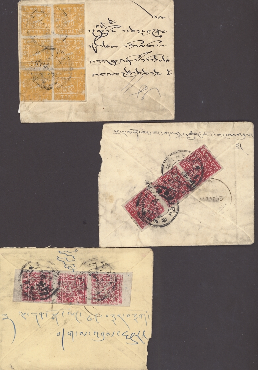 1943-48 a group of covers from Kalimpong on India 1½a. stationery envelope or with India 1½a. cancelled by the despatch c.d.s., each paying the 3tr. rate tied by Phari postmarks with 1943 1tr. deep scarlet-vermilion with 2tr. scarlet, 1947 ½tr. block of six deep golden yellow, setting 3 right side of sheet, 1947 1tr. bluish red vertical strip of three and 1948 1tr. in a pale shade of bluish red vertical strip of three; condition is a little variable. A good variety of frankings. (4 covers)