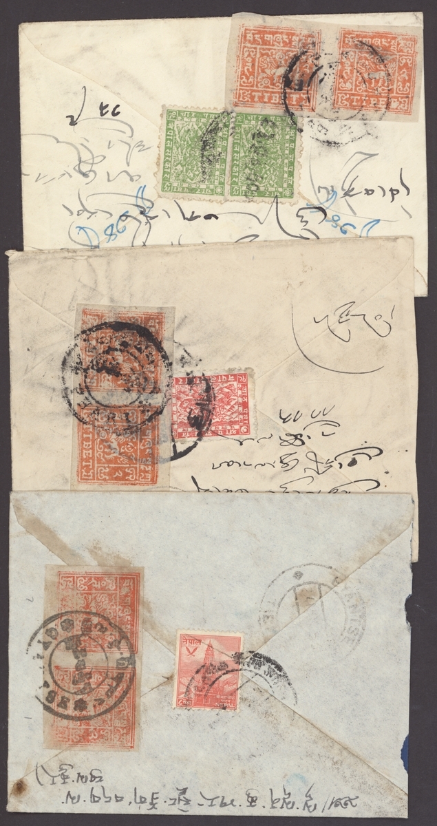 1949-53 covers from Nepal, each bearing Nepal 8p. franking and with Tibet 2tr. pairs in shades of reddish vermilion tied by either Gyantse or Phari postmarks. (4 covers)