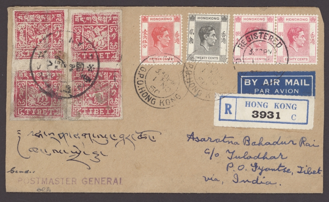 1950 (1 Nov.) opened-our envelope airmail registered from Hong Kong bearing Hong Kong K.G.VI $3.10 franking tied by Hong Kong registered c.d.s. with Gyantse c.d.s. (11.11) on the reverse, the address side bearing 1tr. bluish red in two vertical pairs from the second setting cancelled by Gyantse postmark. Clean and attractive. Photo