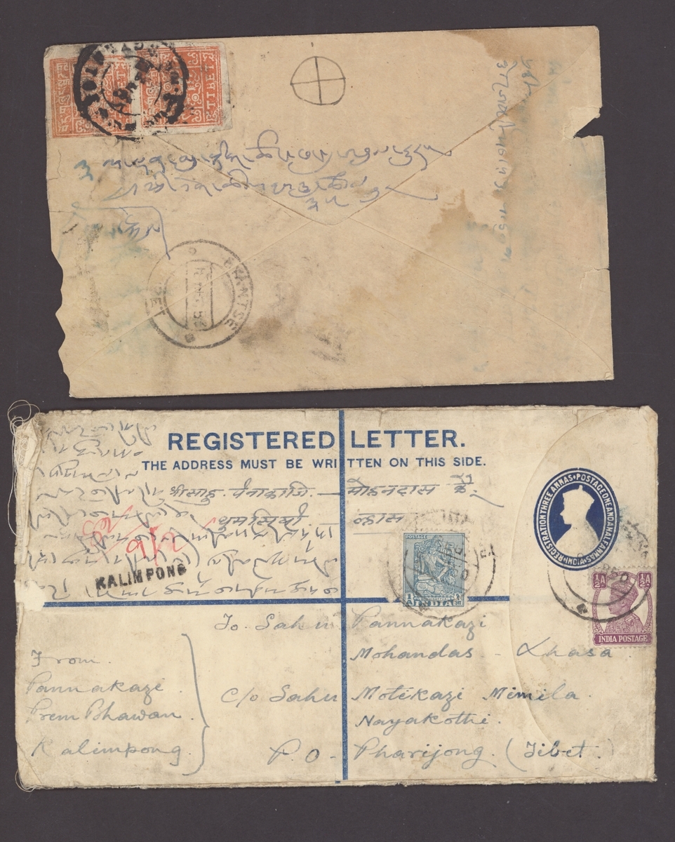 1950-55, a group of covers from India with 1950 Indian registered stationery envelope to Lhasa, uprated 1½a. tied by Kalimpong c.d.s., the reverse bearing 4tr. bright yellow-green tied by Phari postmark (faults), 1952 airmail envelope from Kalimpong bearing, on the reverse, 4tr. bright yellow-green tied by Phari postmark, 1953 envelope from Kalimpong bearing, on the reverse, pair of 2tr. dull orange tied by Gyantse postmark, 1954 envelope from Kalimpong bearing 4tr. bright apple-green tied by superb Gyantse postmark and 1955 envelope from Kalimpong bearing, on the reverse, 1tr. dull orange in a strip of four from the foot of the sheet, setting 4 tied by Lhasa postmark; a couple of the covers are registered. (5 covers)