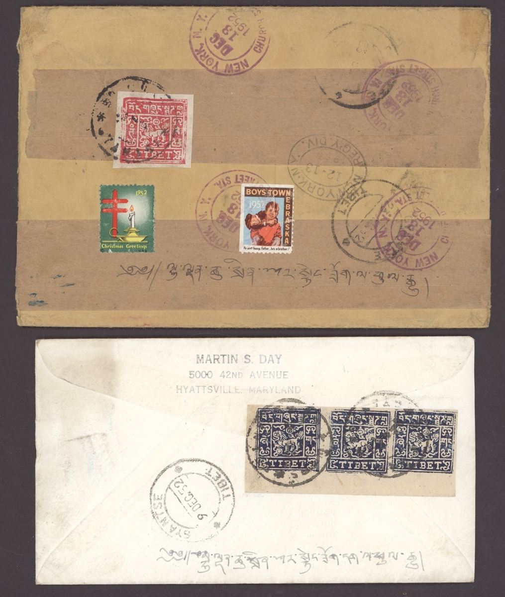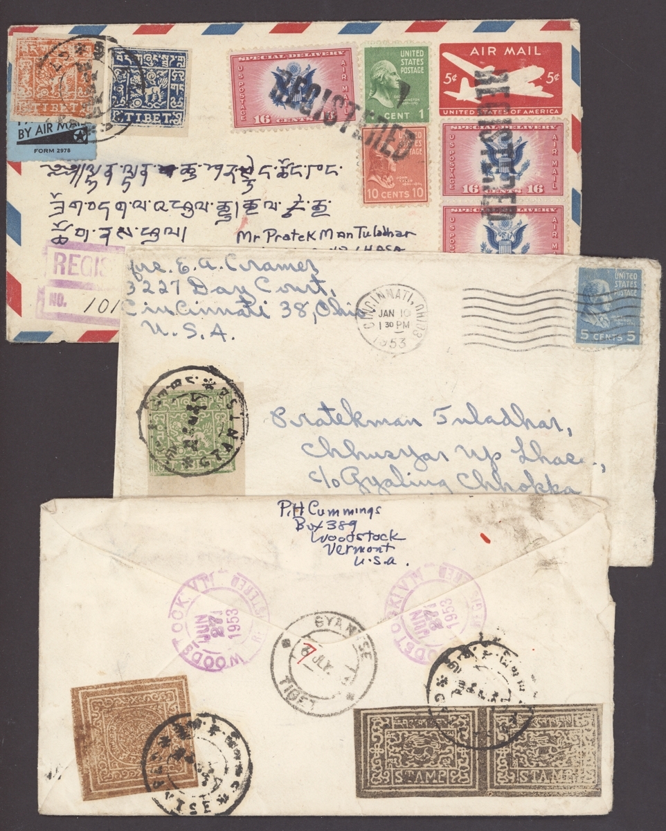 Tuladhar Correspondence: 1952-53 a group of covers from U.S.A. to Gyantse with 1952 airmail bearing 2tr., Newspaper Boys first day cover with strip of three 2/3 tr., 1953 registered airmail bearing 2/3 tr. and 2tr., from Cincinnati bearing 4tr., registered airmail bearing, on the reverse, Official 1/3 tr. bronze-green and pair of 1/3 tr. black. (5 covers)