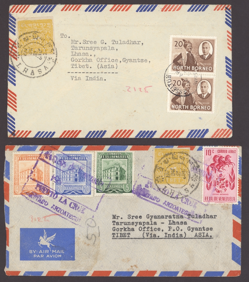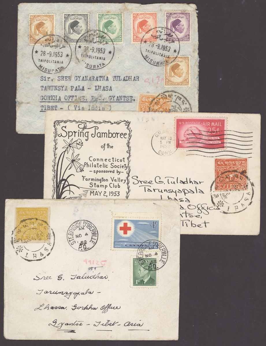 Tuladhar Correspondence: 1952-54, a group of covers from different countries, the Tibetan stamps cancelled by Lhasa postmarks, with 1952 from Canada with ½tr., 1953 from U.S.A. with 1tr., from Libya with ½tr., 1954 air mail from Venezuela with ½tr., and air mail from North Borneo with ½tr. (5 covers)