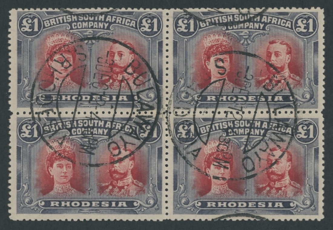 £1 rose-scarlet and bluish black, block of four, positions MG 19-20/24-25, C.T.O. A handsome and rare multiple. S.G. 166, £1,600.