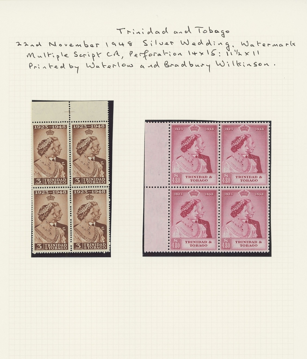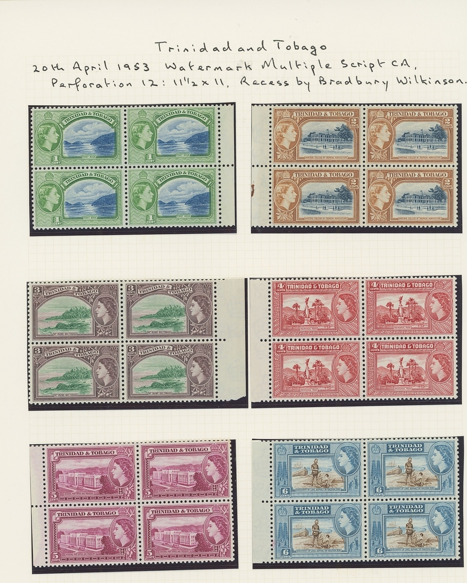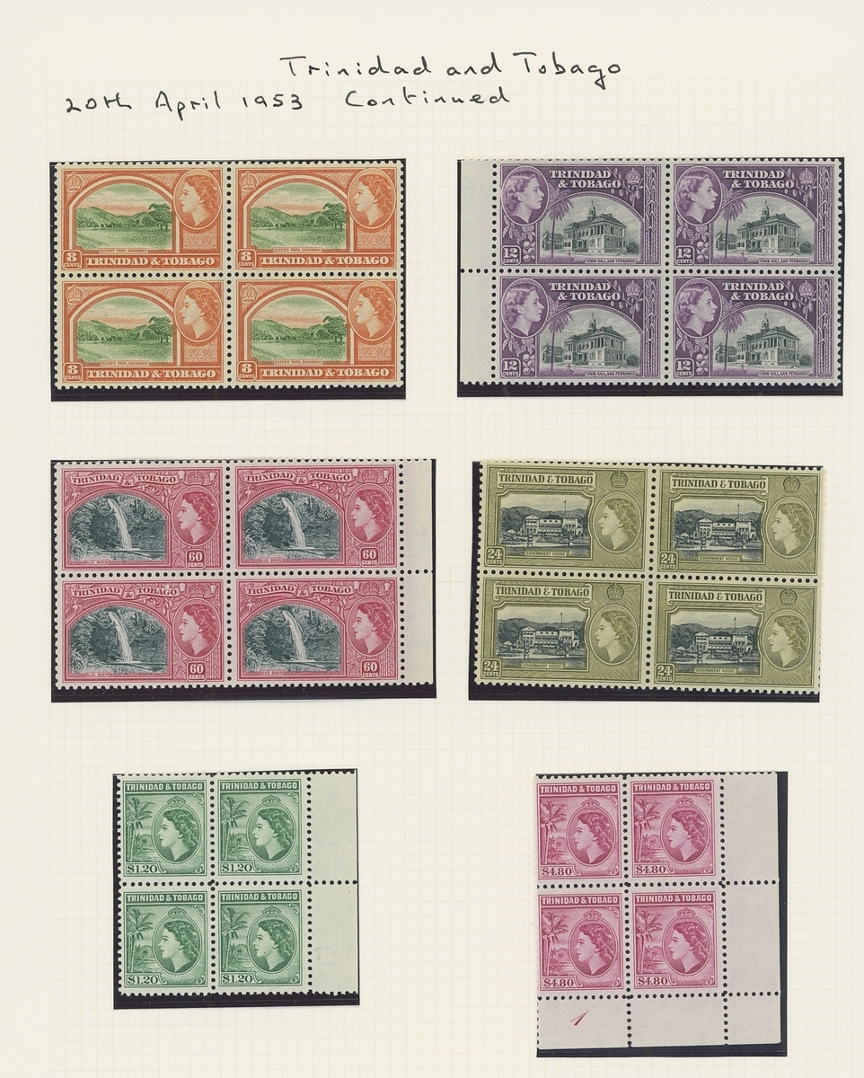 1938-44 mint selection on album leaves, comprising 1938-44 set, 1948 R.S.W. set in marginal blocks of four, 1953-59 set in blocks of four, 1960-67 set, 1962 Independence set, 1969-72 set, fine, unmounted mint.