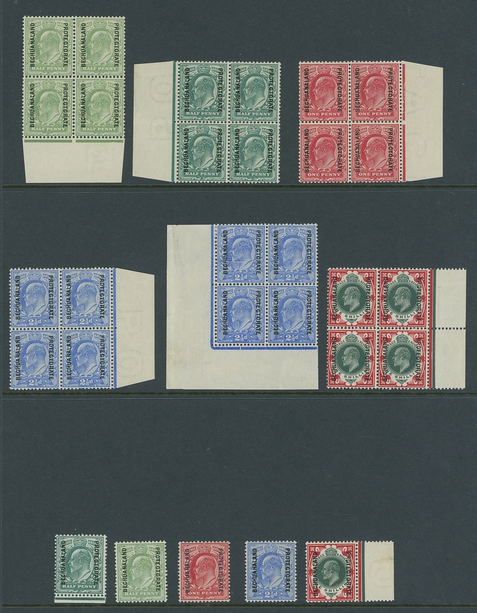 A group of blocks of four (6) comprising ½d. yellowish green, ½d. blue-green, 1d. scarlet, 2½d. ultramarine (2, including one lower left corner) and 1/- deep green and scarlet and also the issued set of five to 1/-; fine mint. S.G. 66-71 group