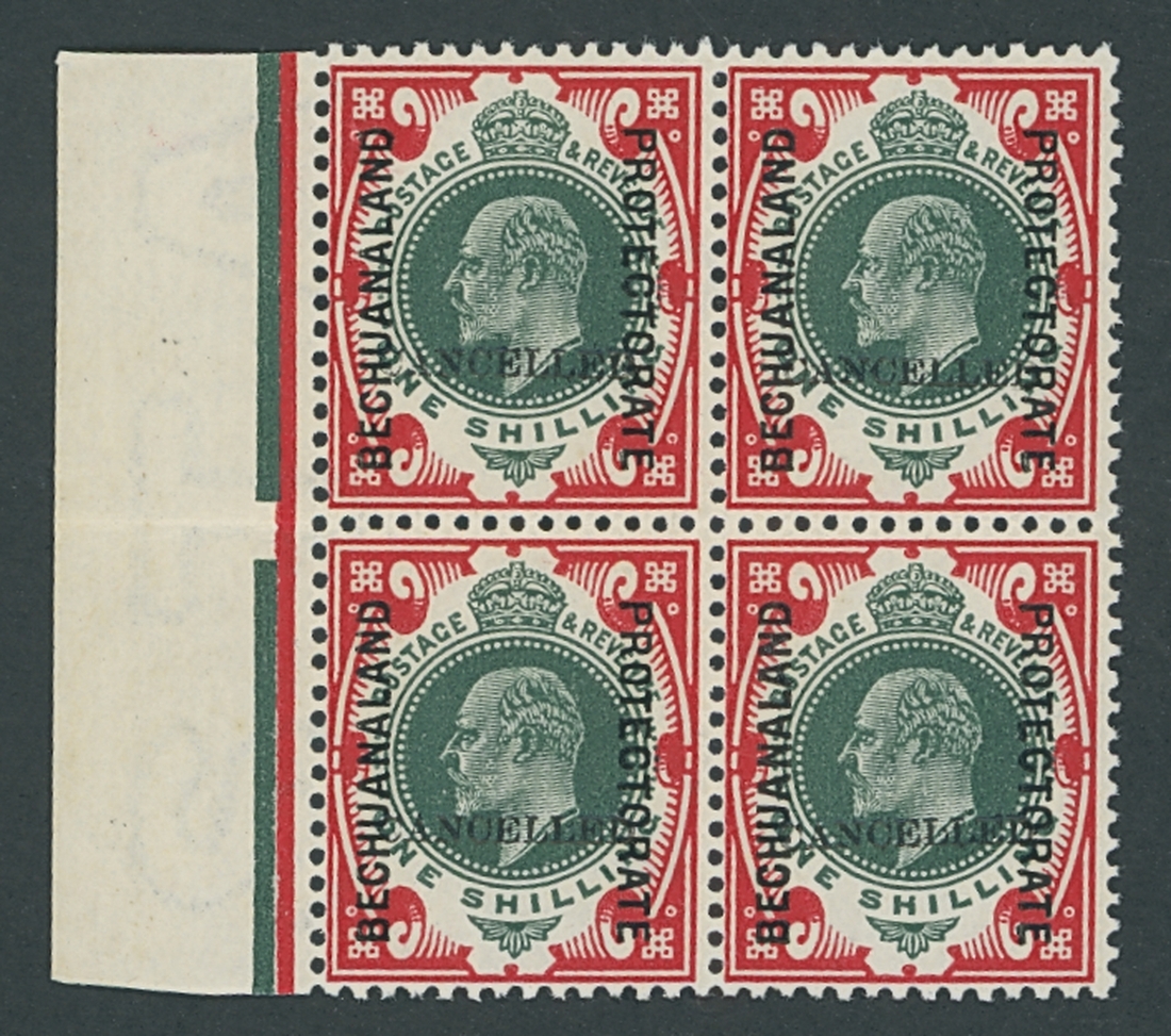 1/- deep green and scarlet, a block of four from the left of the sheet, each overprinted