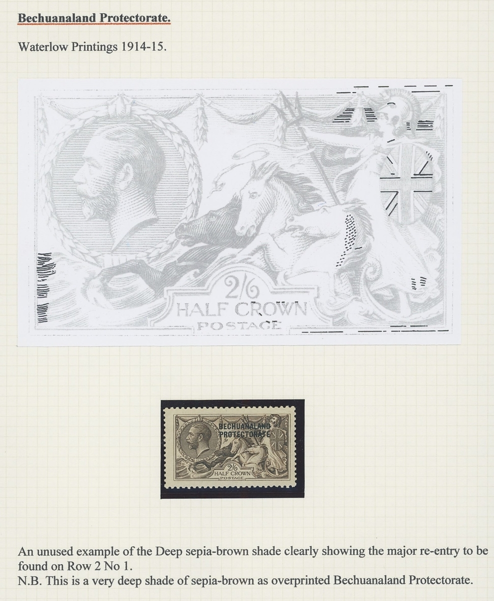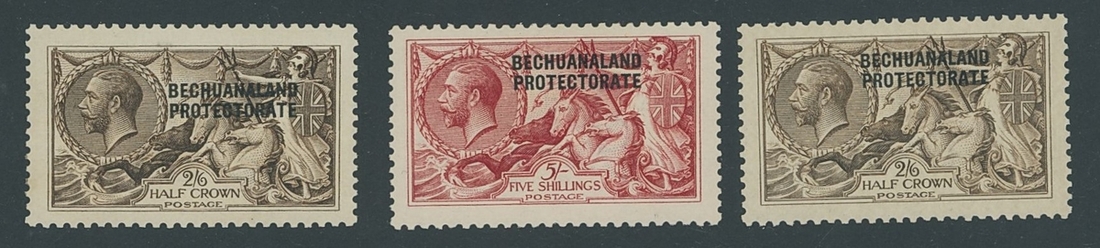 A small mint group (4) comprising 2/6d. deep sepi-brown and 5/- rose-carmine, 2/6d. deep sepia-brown variety overprint double, one albino and 2/6d. deep sepia-brown showing re-entry [2/1]; fine and fresh mint. S.G. 83, 84, 83a, 83b, £2,000