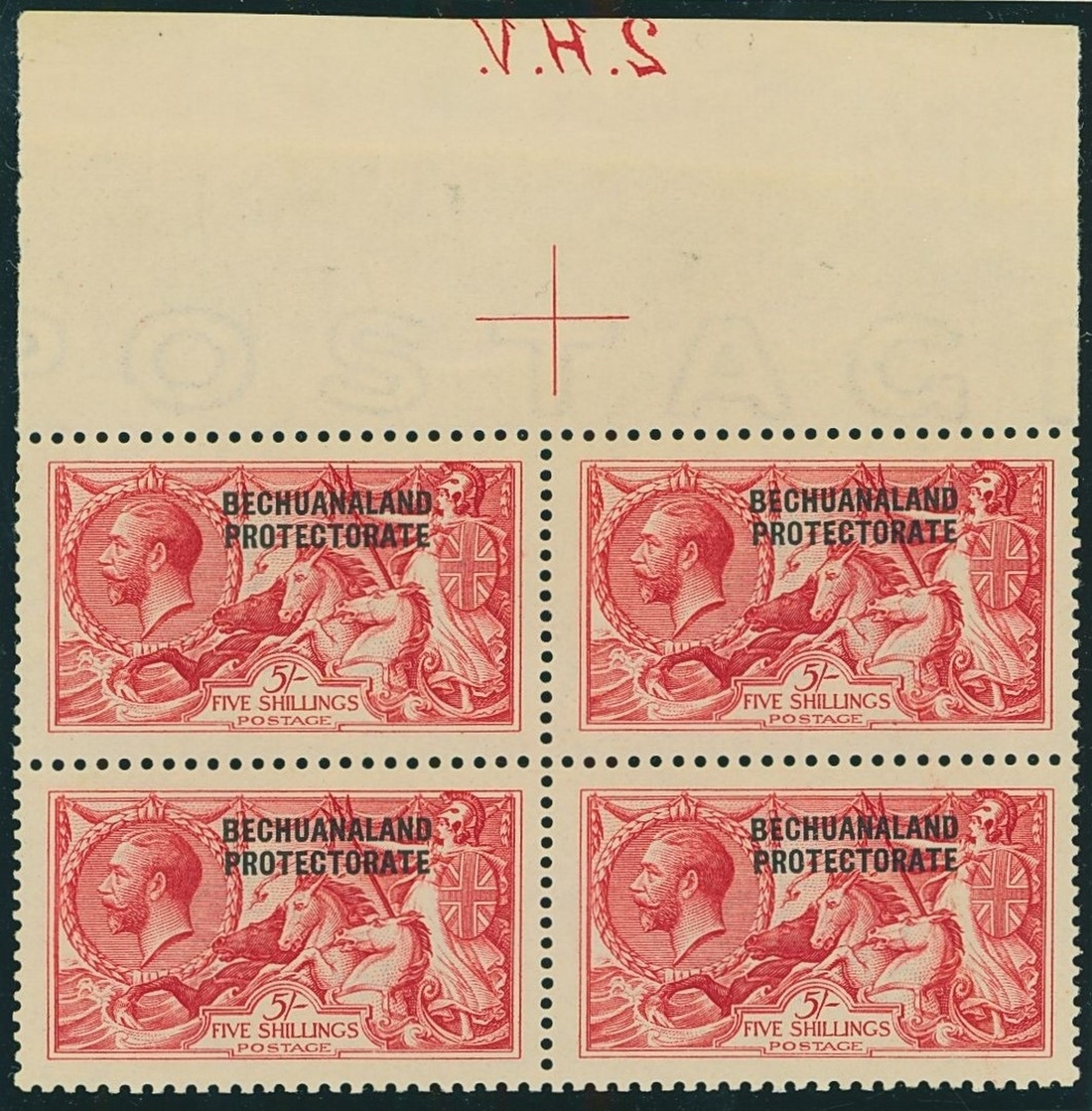 5/- rose-carmine, a block of four from the top of the sheet showing the guide cross and reversed '2. H. V.' plate number in the margin; superb unmounted mint. This block was illustrated in Brian Kearsley's "Discovering King George V High Value Seahorses" on page 232. S.G. 84, £640+