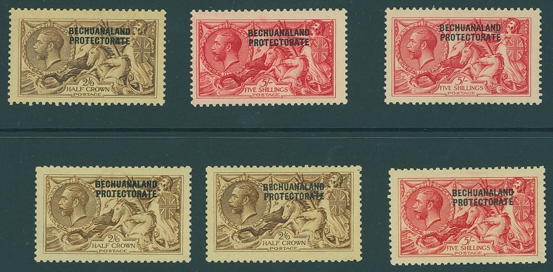 A small mint group (6) comprising a range of shades with 2/6d. deep sepia-brown, 2/6d. pale brown, 2/6d. sepia and 5/- rose-carmine, 5/- bright carmine and 5/- rose-carmine variety overprint double, one albino; fine mint. S.G. 83-84 group and 84a