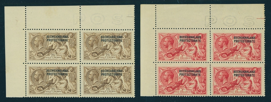 2/6d. pale brown and 5/- bright carmine upper left corner blocks of four, the 2/6d. showing no evidence of the major re-entry usually found at [2/1]; superb unmounted mint. B.P.A. Certificate (2021) for the 5/- block. S.G. 85, 87, £1,720+