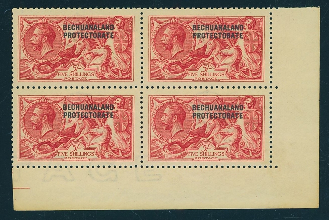 5/- bright carmine lower left corner block of four; fine unmounted mint. S.G. 87, £1,200
