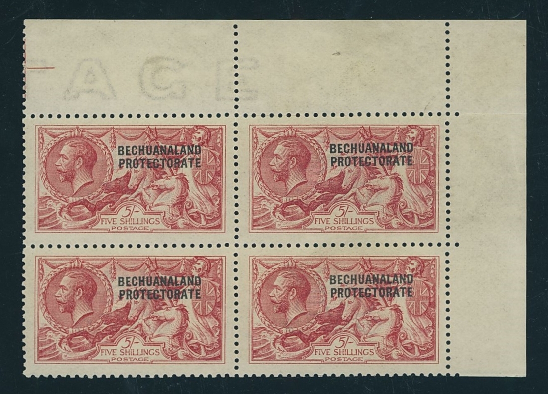 5/- bright carmine, an upper right corner marginal block of four, all showing variety overprint double, one albino; unmounted slightly toned gum, a rare multiple. S.G. 87a, £1,800
