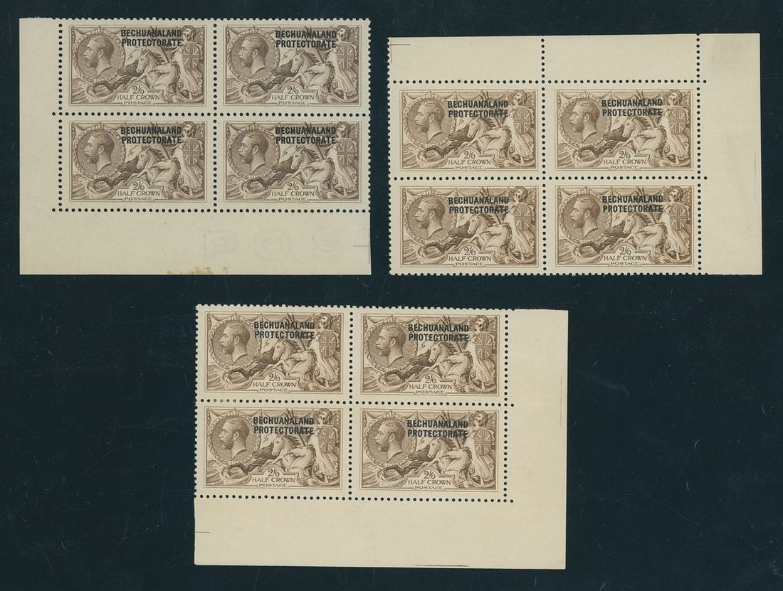 2/6d. chocolate-brown, three corner blocks of four, slightly toned gum on the first, the second showing re-entry (frame lines and ornament in upper-right corner); a good group, unmounted mint. S.G. 88 group, £1,080+