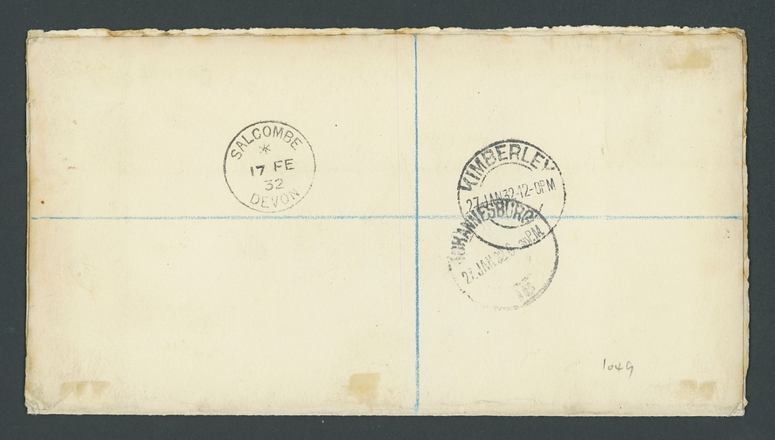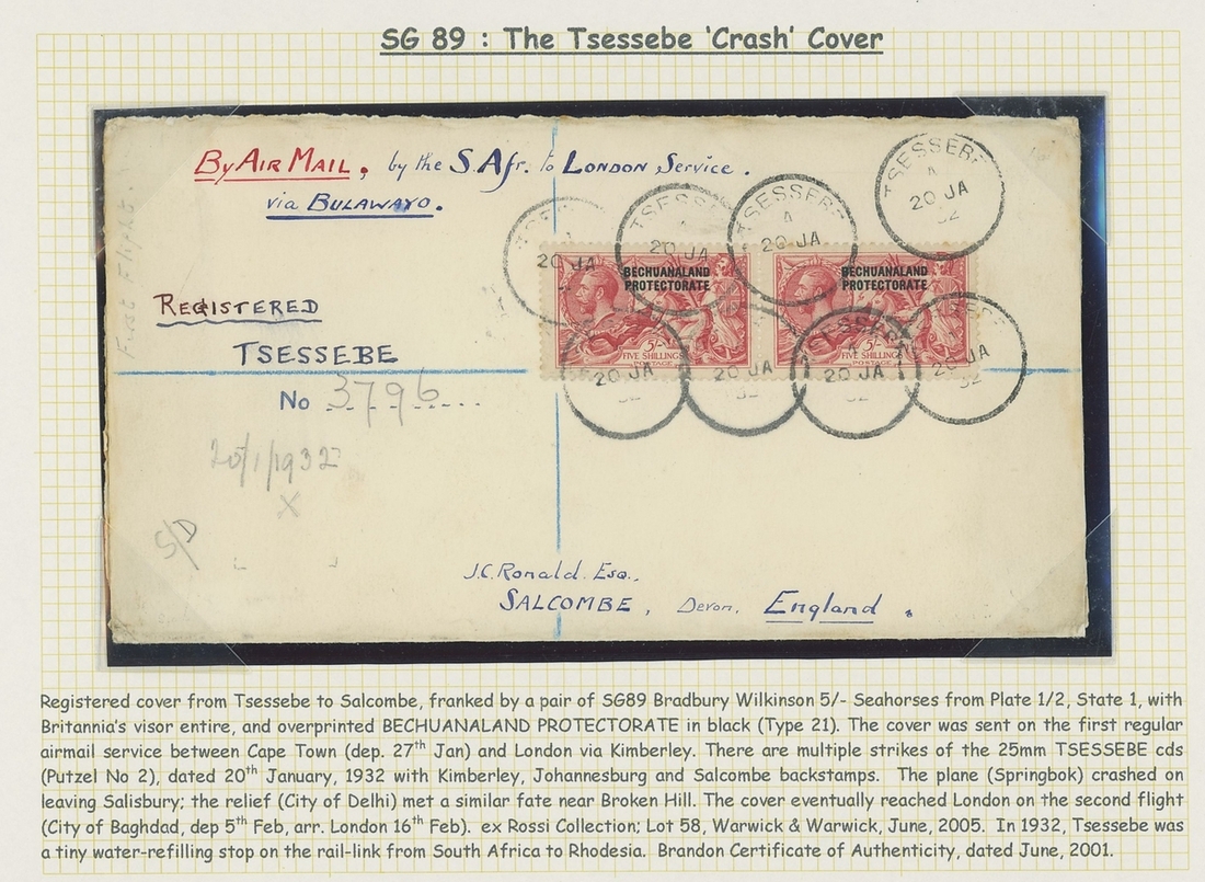 1932 (20 Jan.) envelope registered from Tsessebe to Salcombe, Devon bearing 5/- rose-carmine horizontal pair, tied by eight strikes of the single circle d.s., showing manuscript registration number '3796' in pencil; the original plane 'Springbok' crashed on leaving Salisbury, the relief plane 'City of Delhi' met a similar fate near Broken Hill; the cover eventually reached London on the second flight onboard 'City of Baghdad'; a fine and rare crash cover. Brandon Certificate (2001). S.G. 89