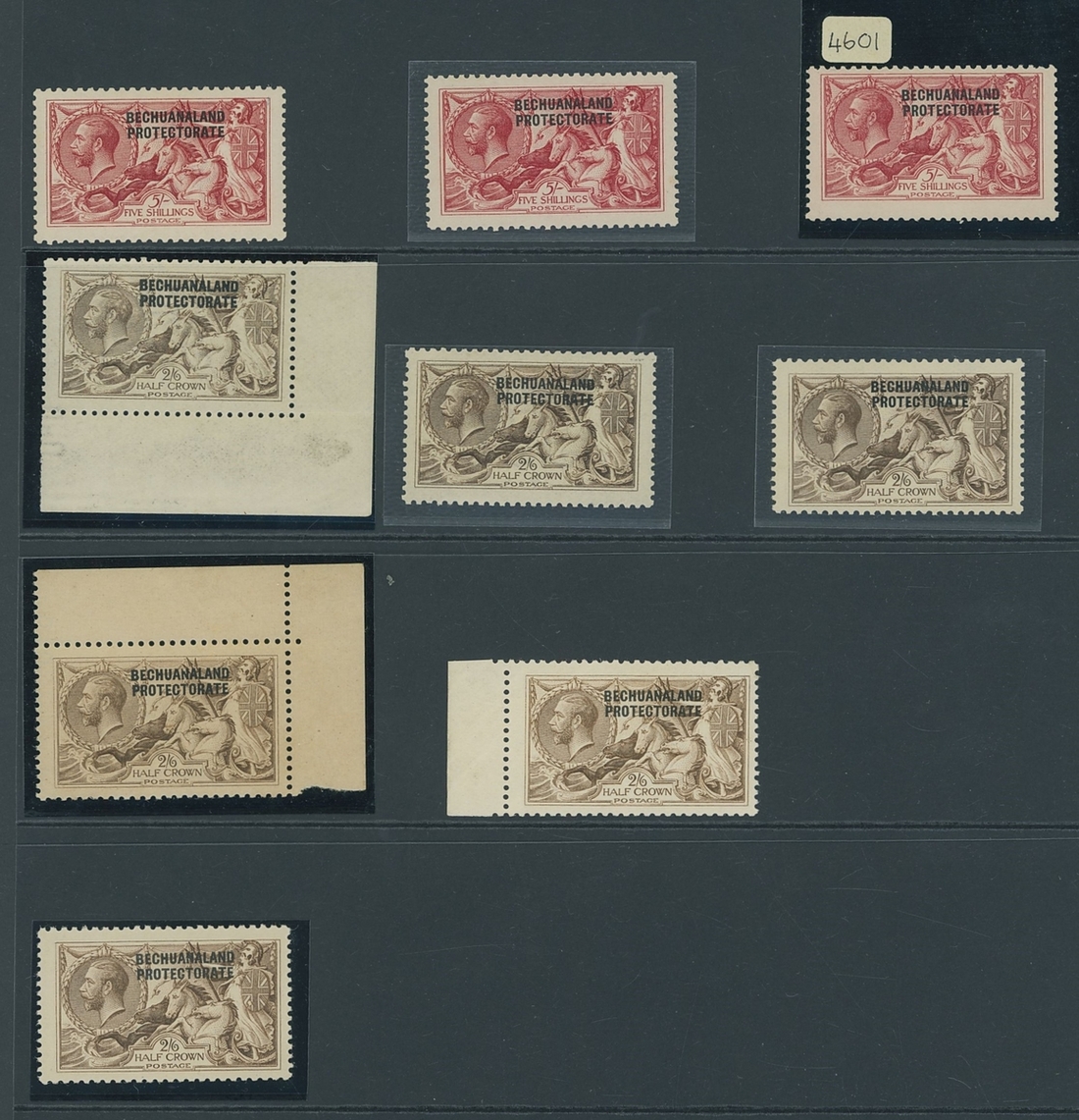 1914-23 mint group on a Hagner page (9) comprising Waterlow 5/- rose-carmine (3, two with variety overprint double, one albino and both with certificates), DLR 2/6d. pale brown lower left corner example and 2/6d. sepia variety overprint double, one albino, Bradbury Wilkinson 2/6d. chocolate-brown (3, one with overprint double, one albino and another with overprint treble, one albino); fine mint. S.G. 84-88c group, £2,400+