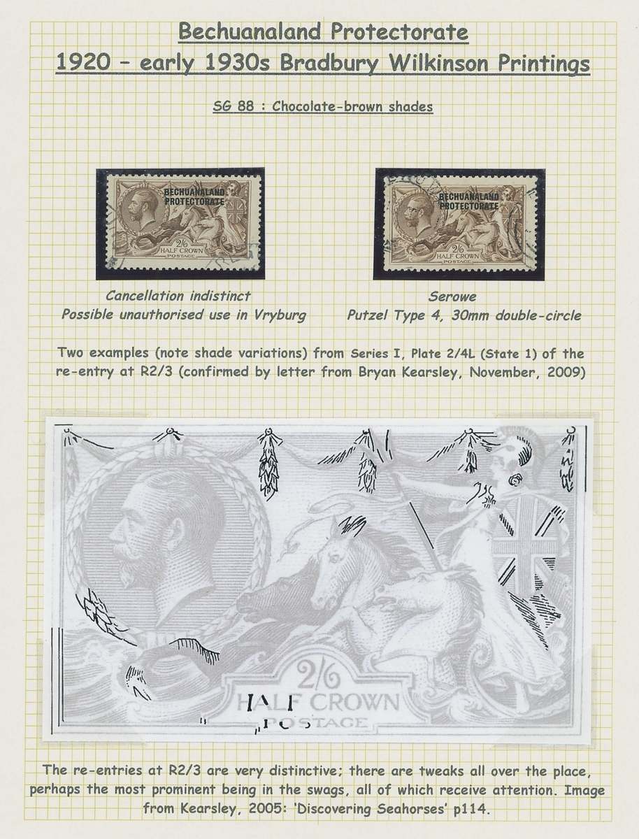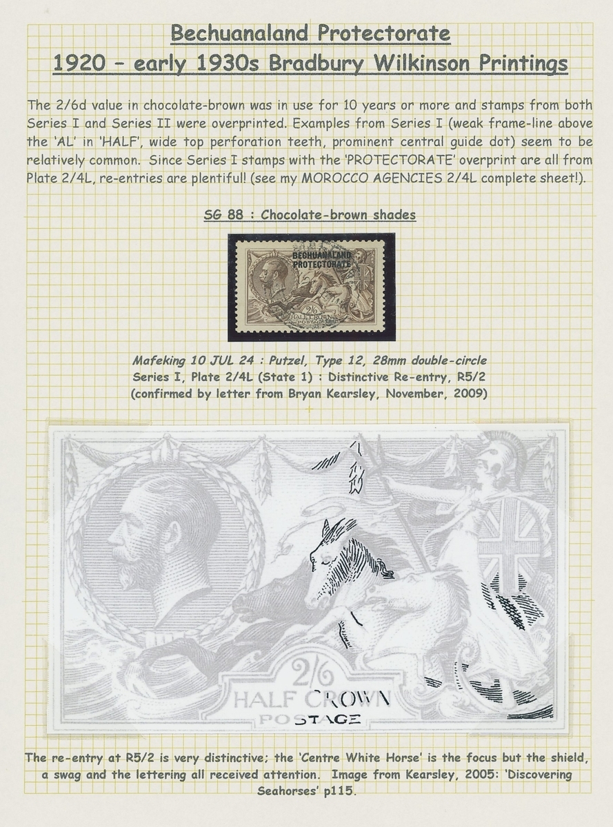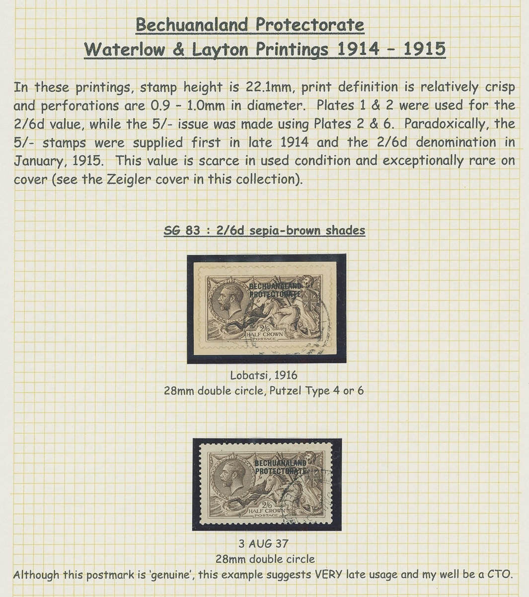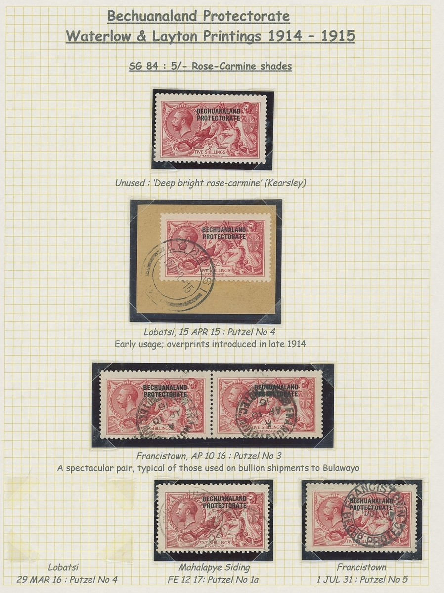 1914-23 balance of the specialised 'Weston' mint and used Seahorse collection written-up on album pages, commencing with a checklist for identifying the printings and then with a group of each printing, Waterlow 1914-15 2/6d. used (shades, one with BPA cert.), 5/- rose-carmine mint and used (6 including a horizontal pair and with a variety of cancellations), 5/- rose-carmine variety overprint double, one albino, an example of the 2/6d. and 5/- both showing forged