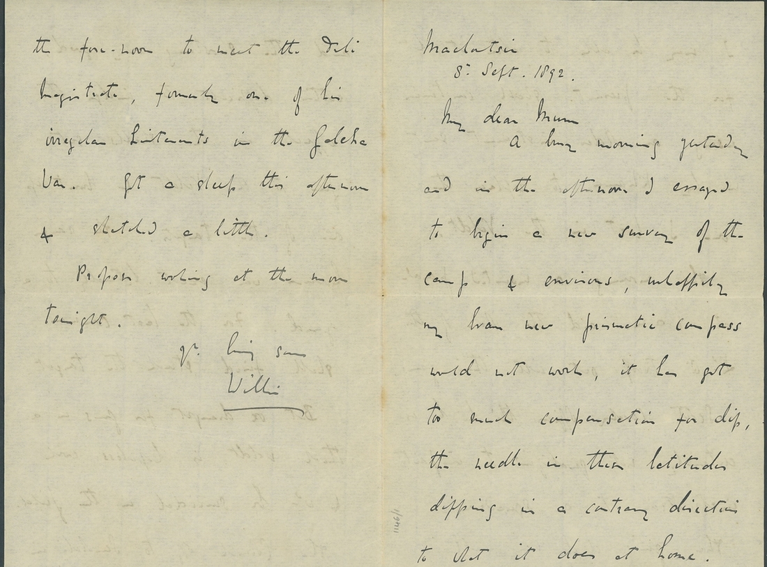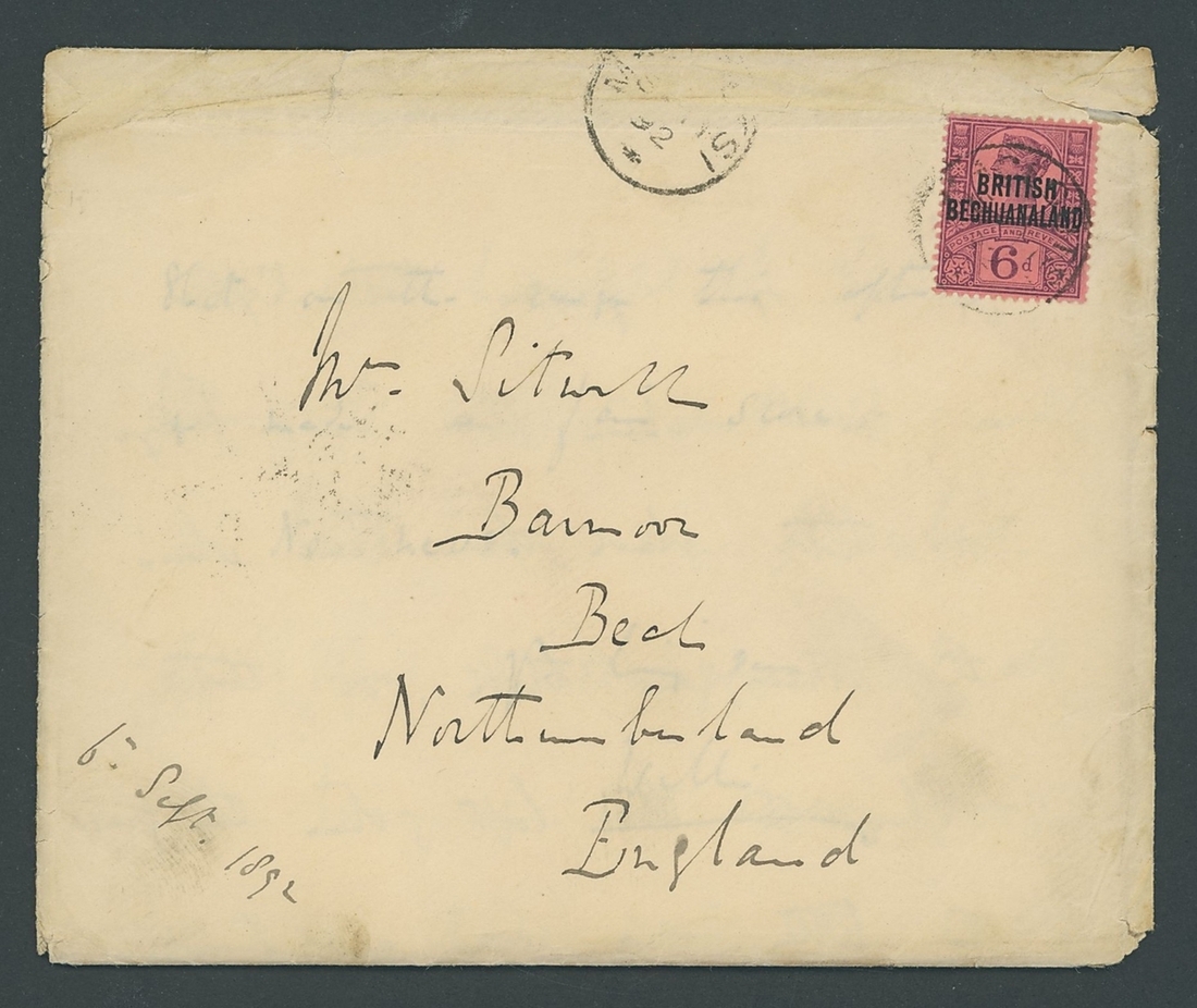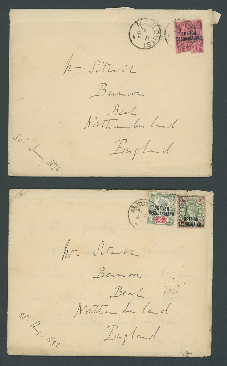 1892 (30 June), (28 Aug.) and (6 Dec.) envelopes with enclosures written by William Sitwell at Macloutsie to his mother in England, the first and last bearing British Bechuanaland 1891 6d., the other bearing 2d. and 4d., all tied by Macloutsie c.d.s., the first letter mentions the fraught relationship between the military and Reverend Moffat, and the last discuss an unhappy relationship with a fellow officer and a lond discourse on hunting wildebeest. Also two letters, (8 and 11 Sept.), the first about the failure of his brand new prismatic compass and describes how gunnery practice set fire to the veldt, the second discusses his corps and regiment. All with a typed transcript