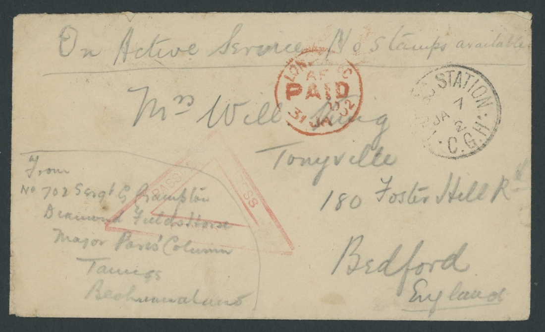 1902 (7 Jan.) Anglo-Boer War envelope from a Sergeant in the Diamond Fields Horse, Major Pares' Column at Taungs to England, headed "On Active Service No stamps available", showing Taungs Station and red London Paid datestamps and red triangular Passed Press Censor h.s.
