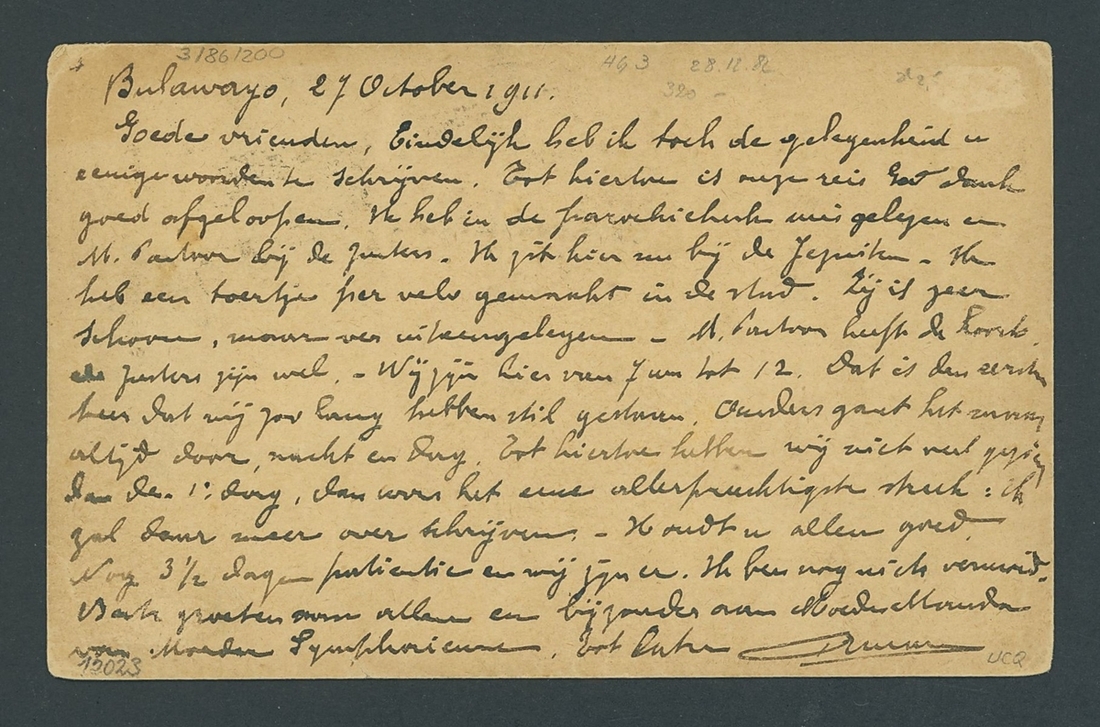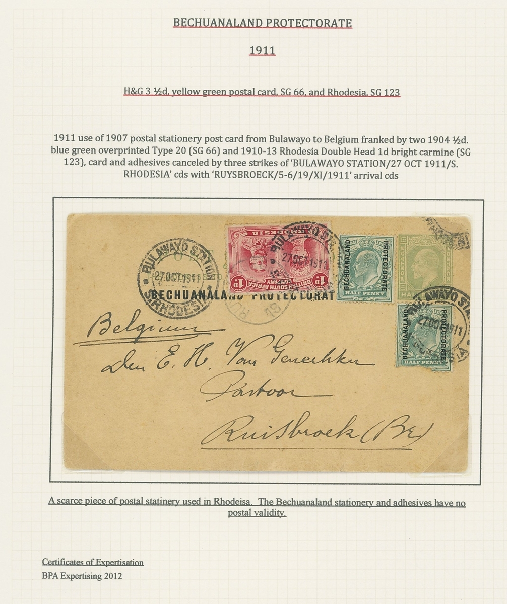 1911 (27 Oct.) ½d. postal stationery card from Bulawayo to Belgium additionally franked with 1904-13 ½d. blue-green (2, one defective) in combination with Rhodesia 1910-13 1d. bright carmine, all tied by