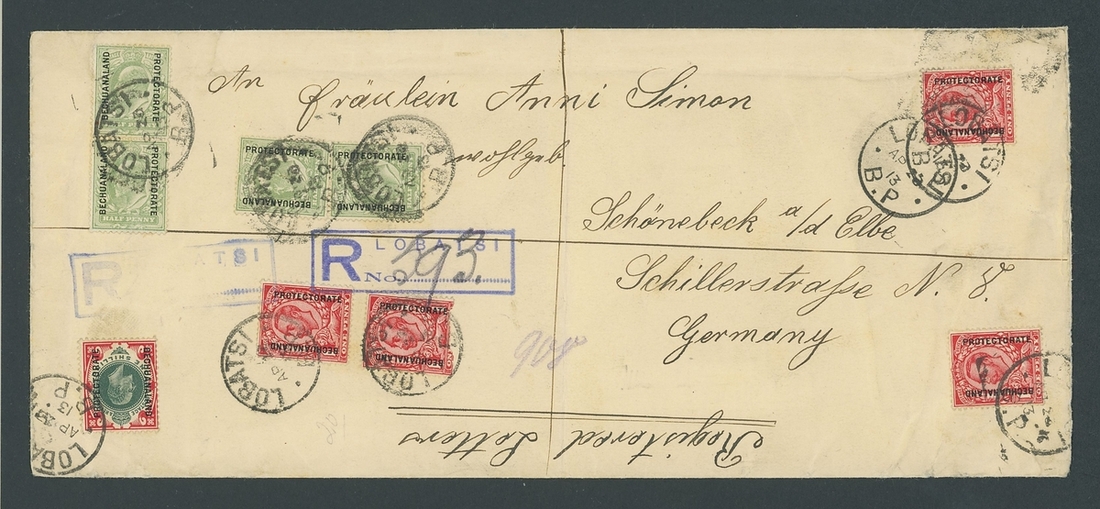 1913 (23 Apr.) long envelope registered from Lobatsi to Germany bearing KEVII ½d. yellowish-green (4) and 1/- green and carmine in combination with KGV 1d. scarlet (4) all tied by