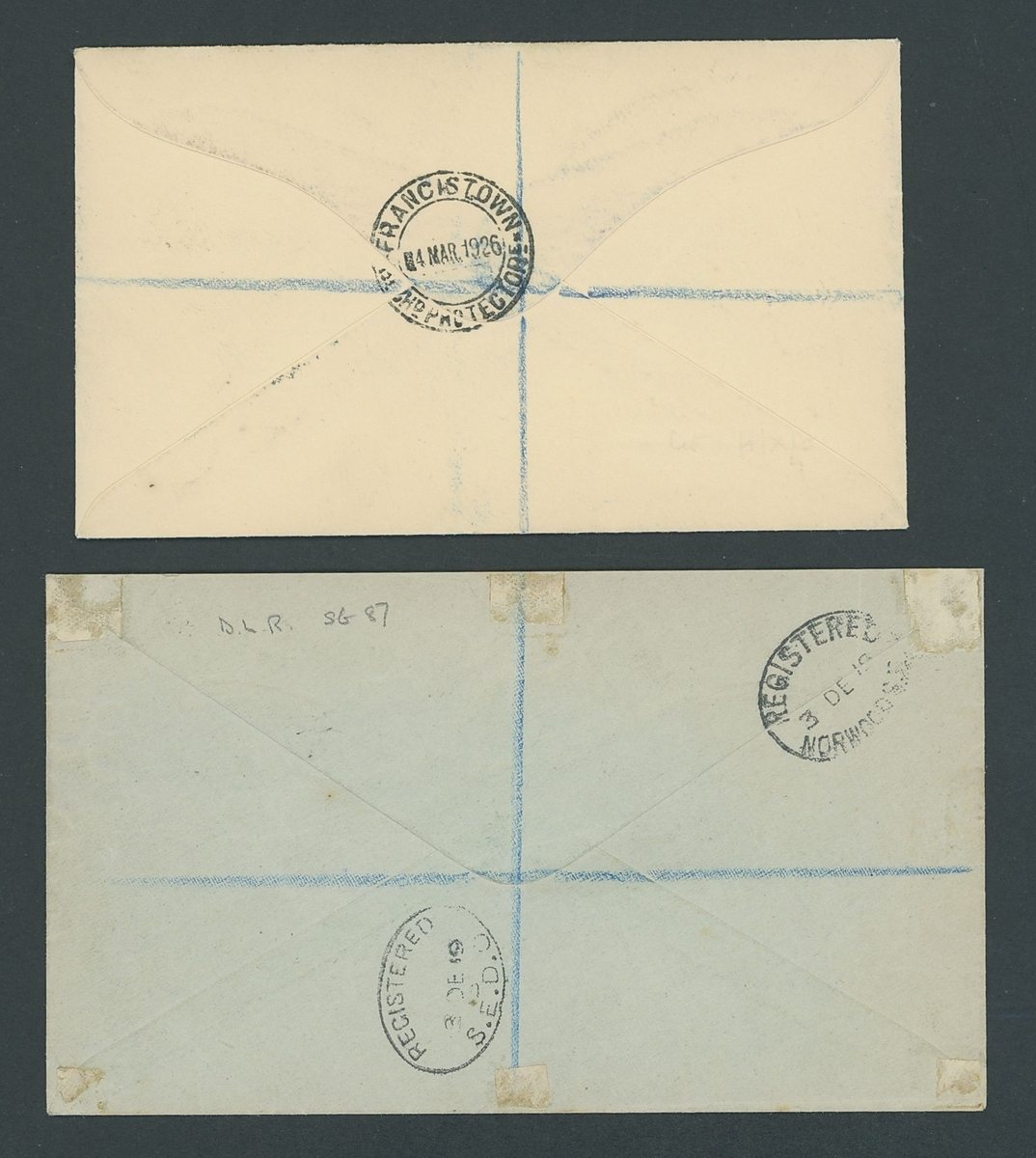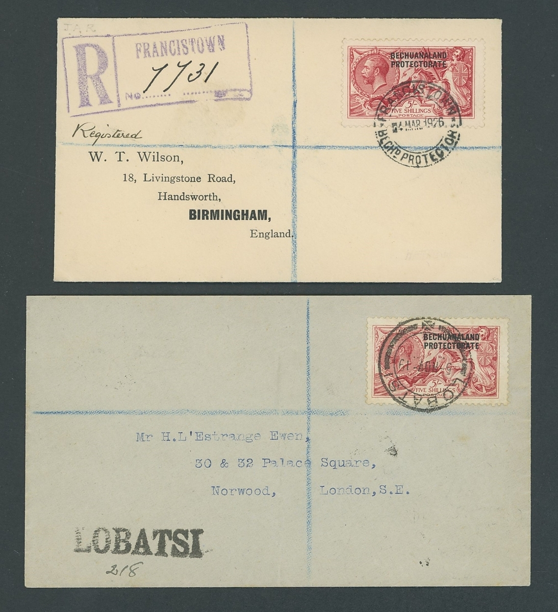 1919-26 pair of covers comprising 1919 envelope registered from Lobatsi to London bearing DLR 5/- bright carmine (S.G. 87) and1 926 (4 Mar.) 'Wilson' envelope registered to Birmingham bearing Waterlow 5/- rose-carmine (S.G. 84). R.P.S. Certificate for the latter