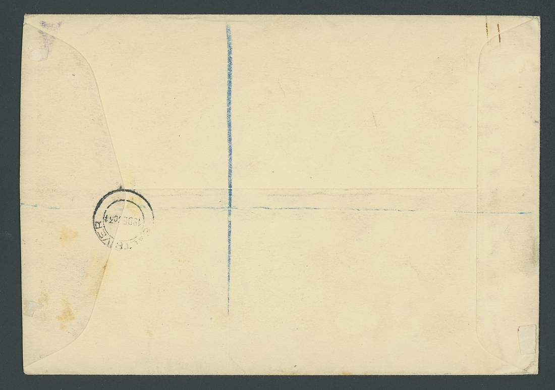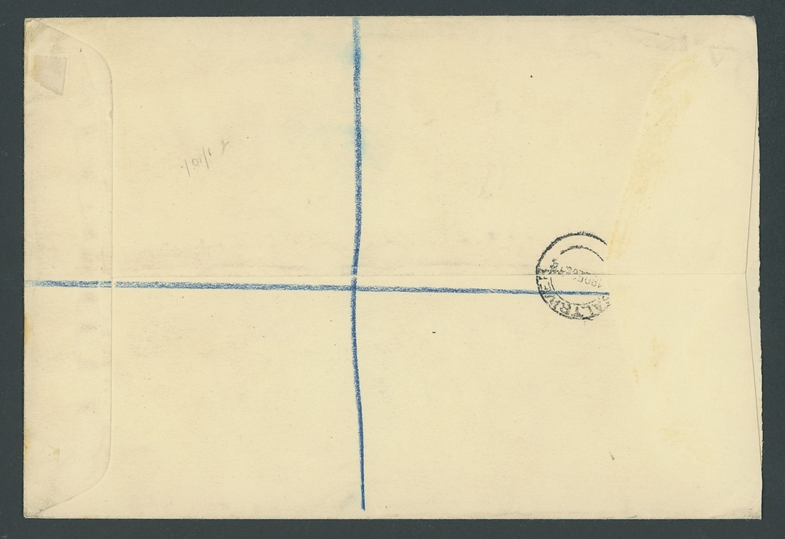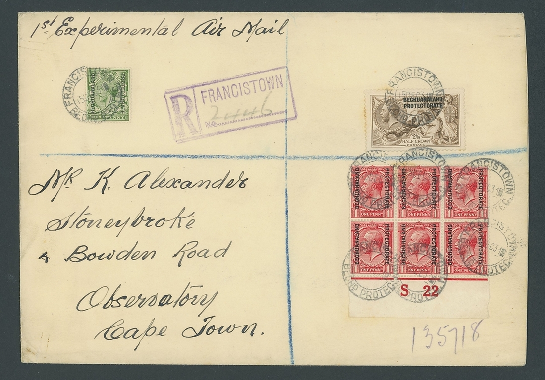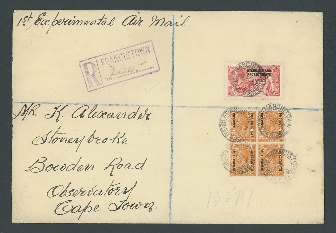 1919 (Dec.) pair of large envelopes registered to Cape Town via the '1st Experimental Air Mail', endorsed at top of each in black manuscript and one bearing KGV ½d. and 1d. block of six from the foot of the sheet with Control