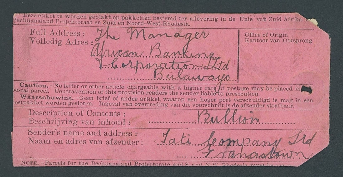 1915 (22 Mar.) Inland Parcel Post tag for bullion, sent registered from the Tati Co. Ltd. to the African Banking Corp in Bulawayo, franked at 9/10d. bearing unappropriated die 1/-, Seahorse 5/- and 4d., 6d. and 1/- (3) all tied by