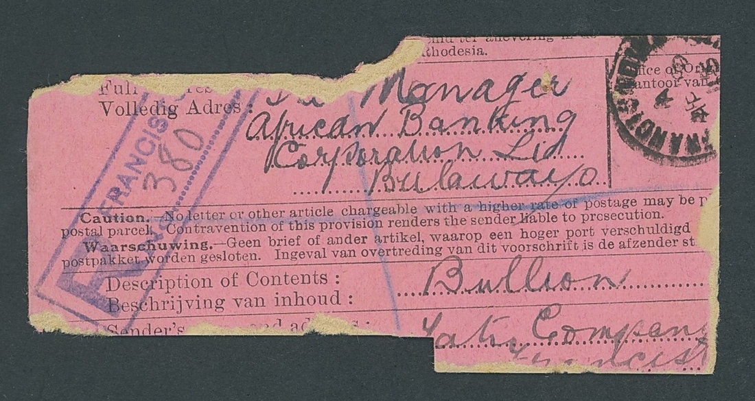 1915 (19 Apr.) large part Gold Bullion Parcel label from the Tati Co. Ltd. to African Banking Corporation bearing unappropriated die 1/- and 10/- used in combination with KGV 4d. and 1/- (4), all tied by