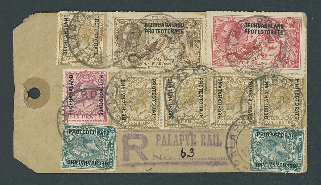 1921 (19 Nov.) parcel label bearing KGV Seahorse 2/6d. and 5/- in combination with 4d. (2), 6d. and 1/- (5), all tied by