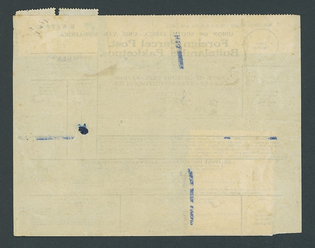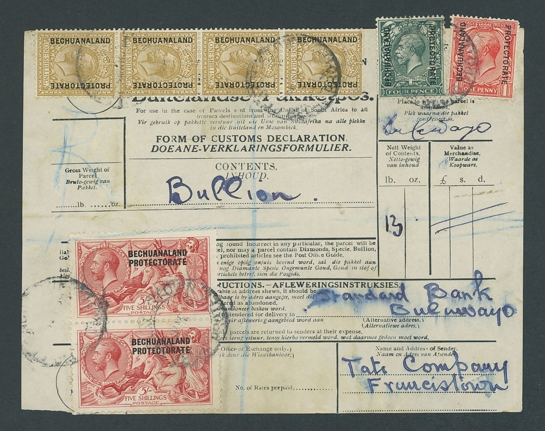 1926 bi-lingual 'Foreign Parcel Post' label sent from the Tati Co. Ltd., Francistown, addressed to the Standard Bank, Bulawayo with contents stated as 'Bullion' and weighing 13lb., franked 14/5d. comprising Seahorse 5/- pair in combination with 1925-27 1/- strip of four with watermark inverted and 1d. and 4d.; an exceptionally rare combination, the 1/- strip being one of the largest recorded multiples of this variety