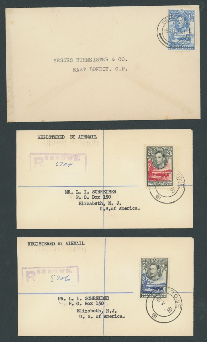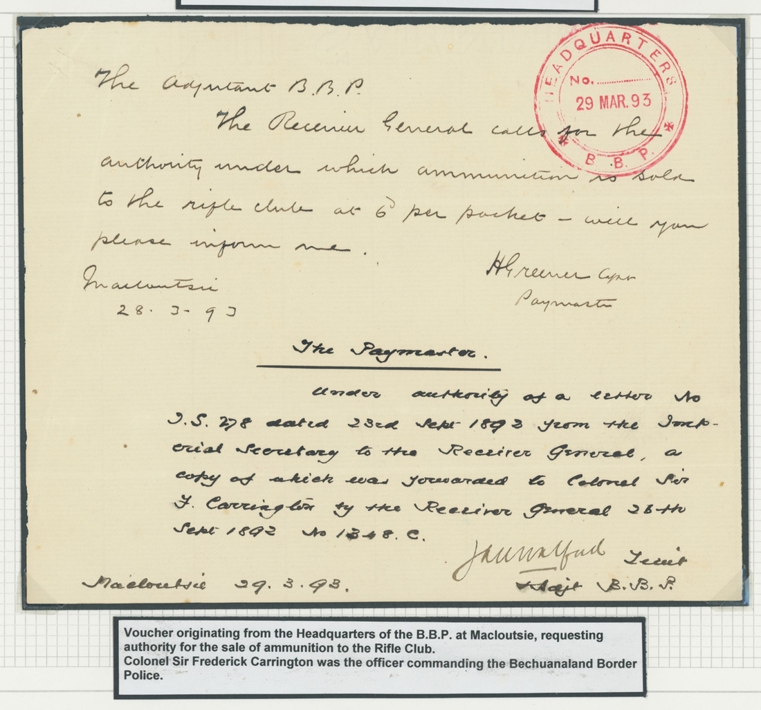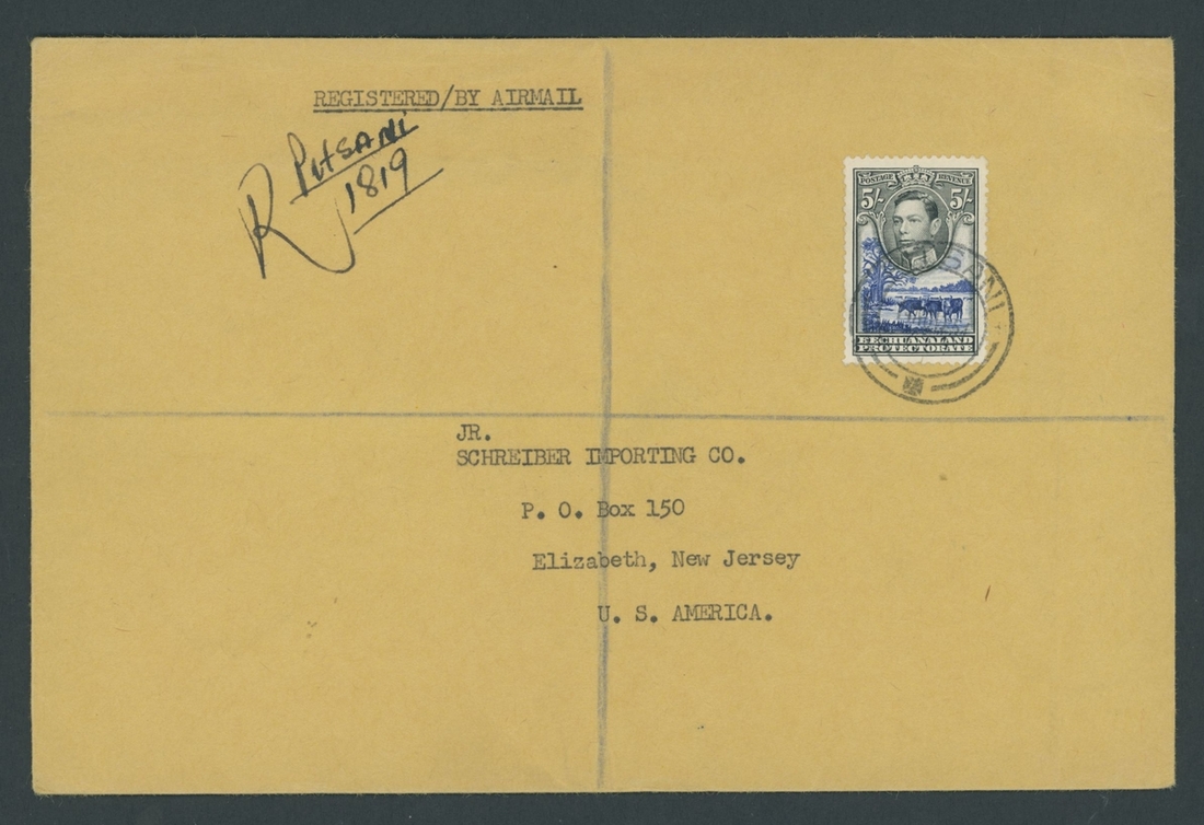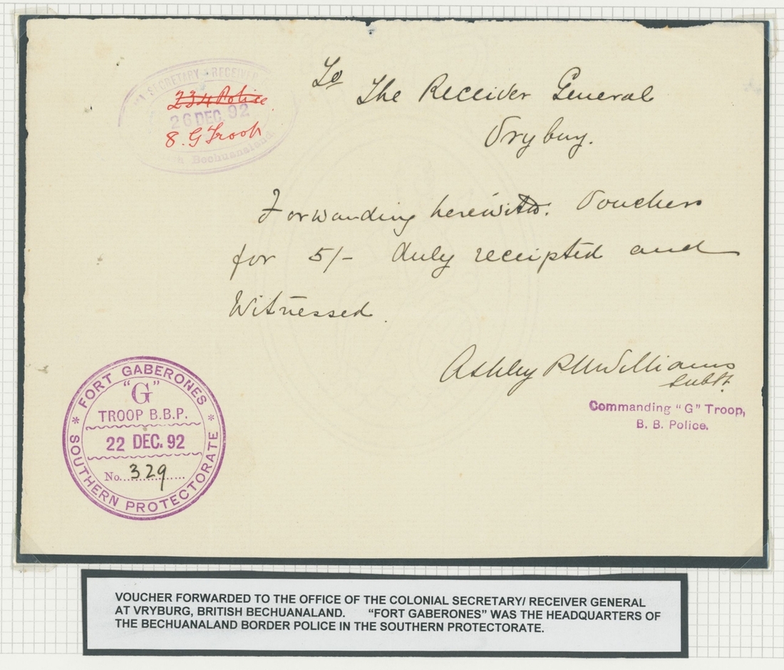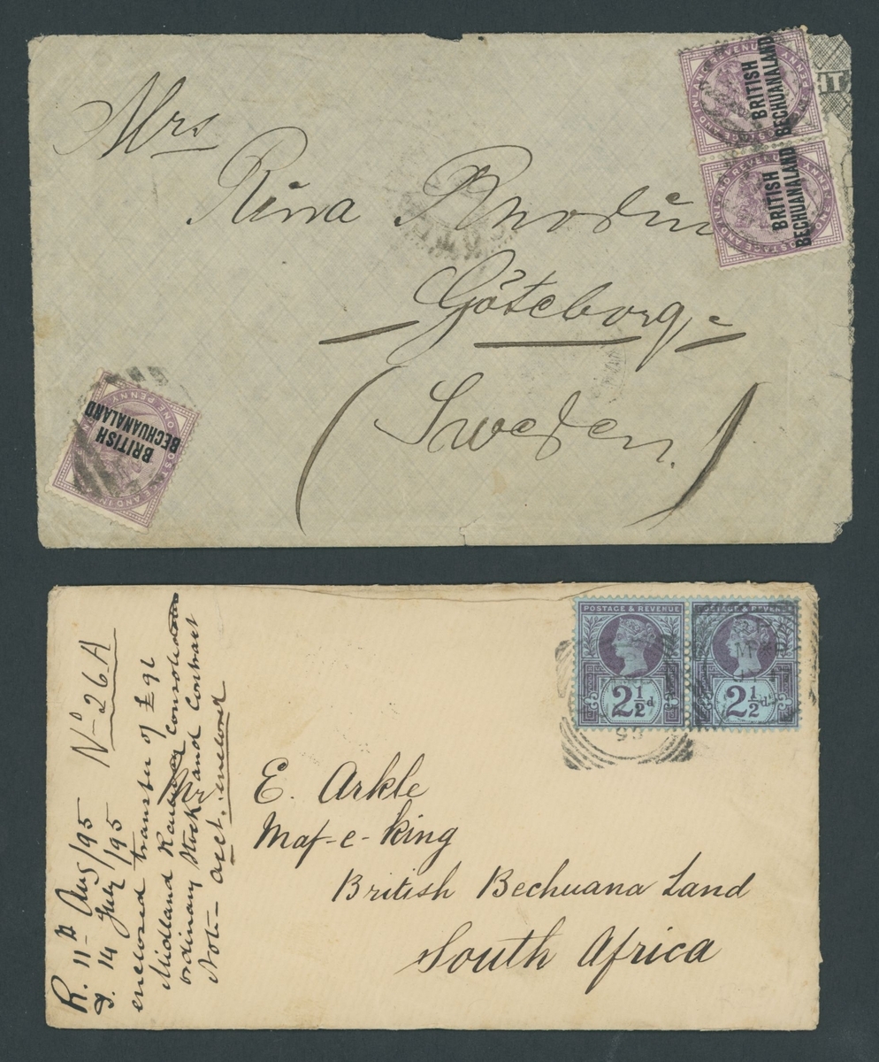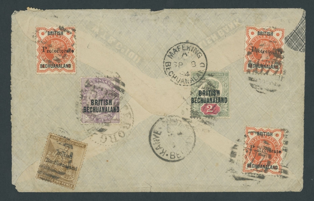 A group of covers and other items (8) comprising 1895 (17 July) incoming double rate envelope to Mafeking, bearing GB 1897 2½d. pair tied by Morpeth squared-circle d.s. and showing arrival c.d.s. (11.8) on reverse; the envelope with recipient's notation at left; 1894 (8 Sept.) envelope to Sweden, bearing British Bechuanaland 1891 1d. (4, one on reverse) and, on reverse, 1885 2d., 1891 2d. and Protectorate 1890 ½d. (3), all tied by "677" barred numeral and showing, on reverse, Kanye, Mafeking and arrival datestamps; Bechuanaland Border Police 1892 (22 Dec.) and 1893 (29 Mar.) vouchers, the former superb circular